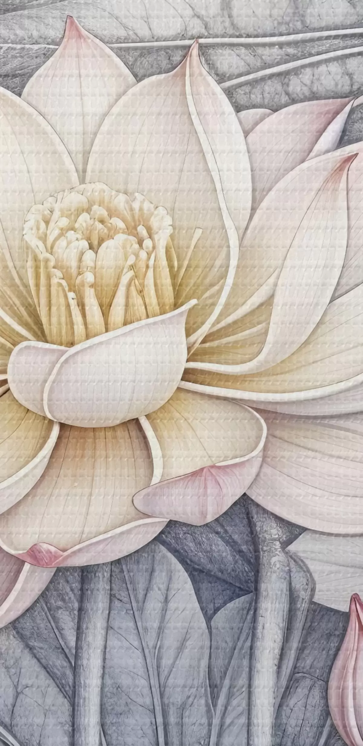 Peinture Grandes fleurs de lotus roses et blanches avec des feuilles et des tiges vertes sur un fond clair avec des pétales et des centres détaillés Art. s42221