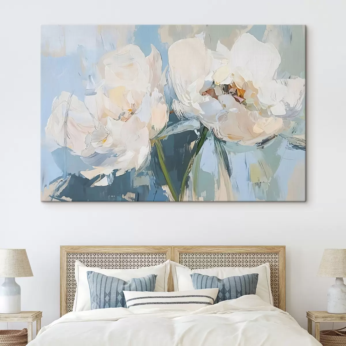 Peintures Peinture à l'huile abstraite minimaliste blanche imitant les pivoines sur un fond bleu doux s42226