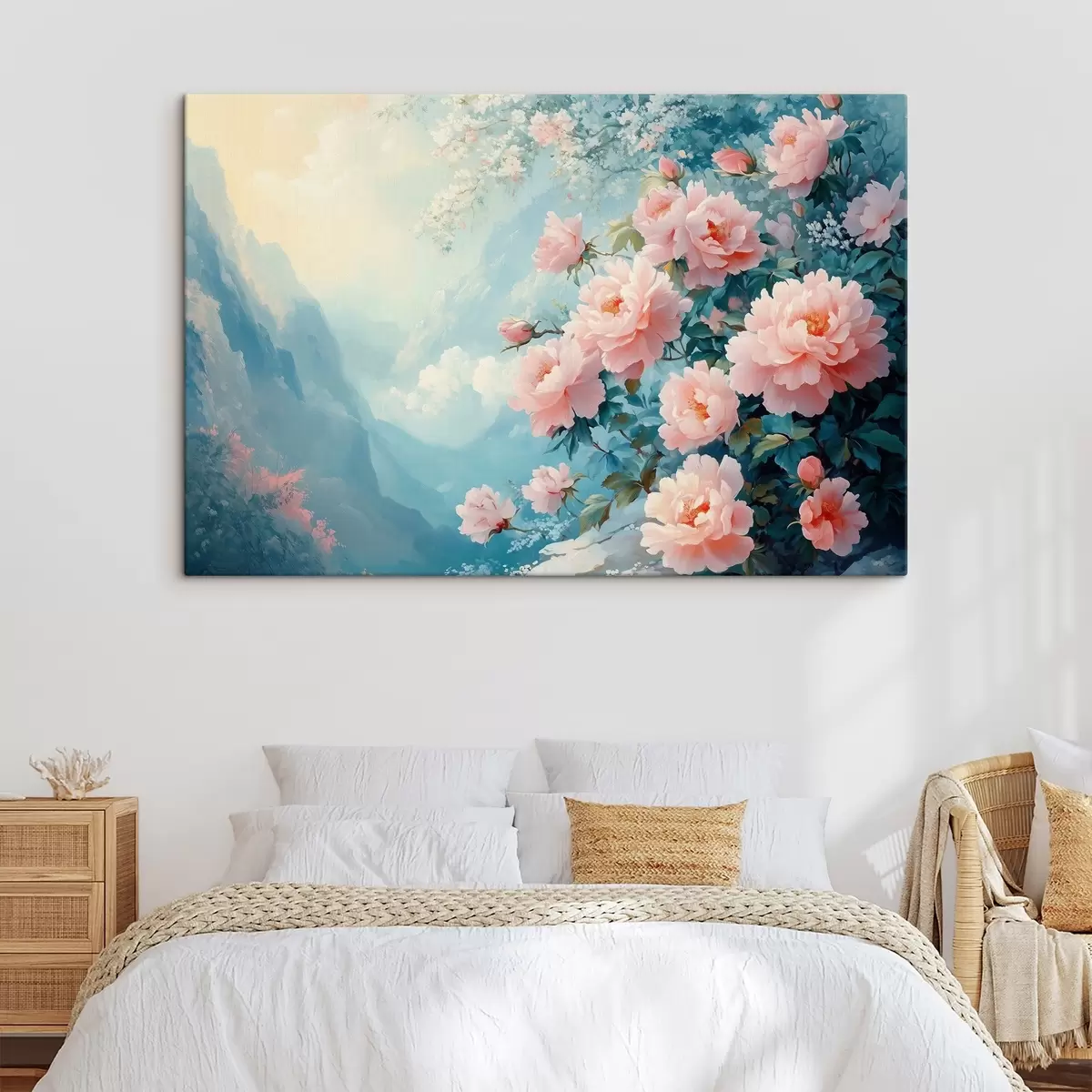 Peinture Montagnes bleues et fleurs au premier plan Art. s42324
