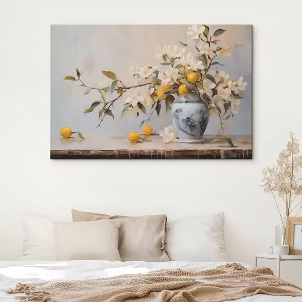 Peintures Vase avec branches de fleurs blanches et peinture imitation citron s42360