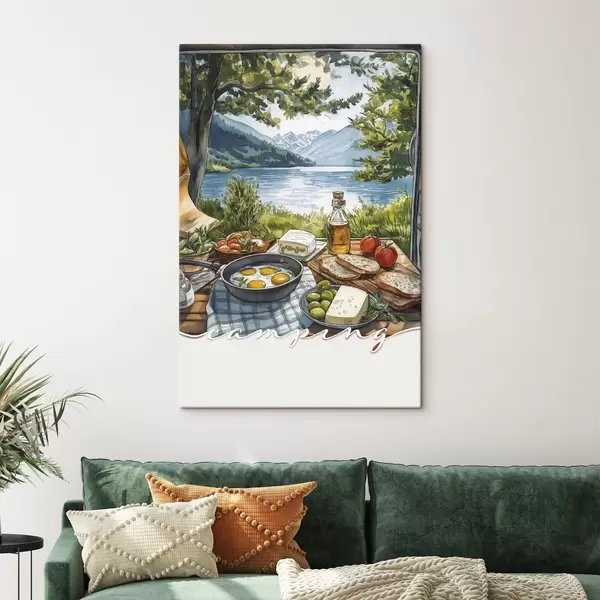 Peinture Camping esthétique, style aquarelle, lac d'été, nature, nourriture Art. s42428