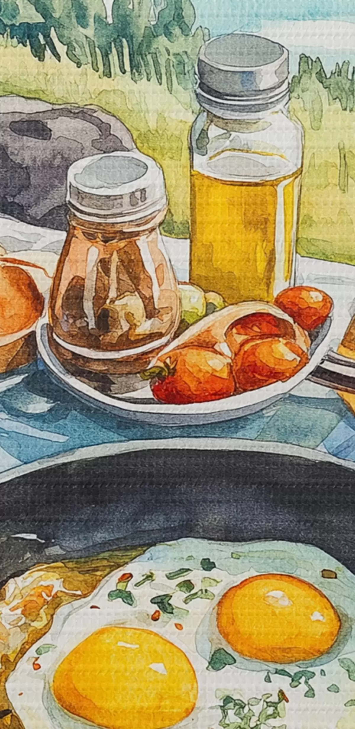 Peinture Petit déjeuner esthétique près du lac, style aquarelle Art. s42432
