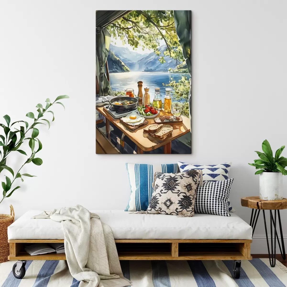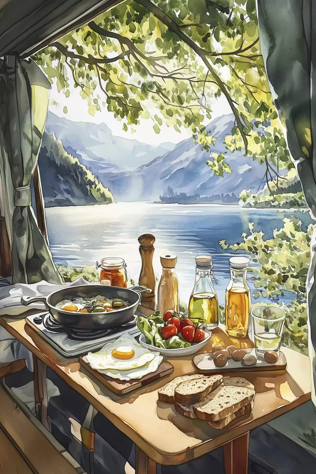 Peinture Belle matinée d'été, lac, style aquarelle, petit déjeuner, voyage Art. s42433