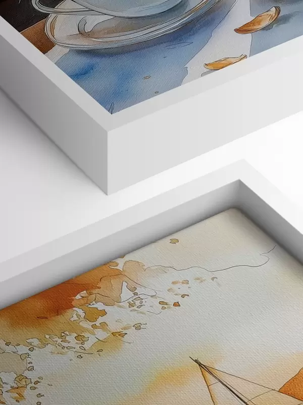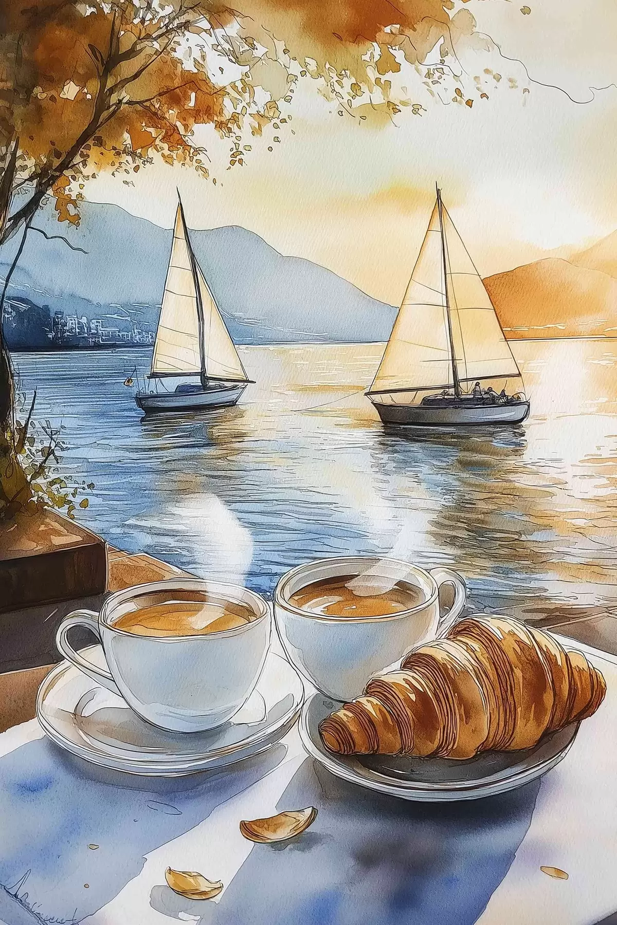 Peintures Coucher de soleil sur le lac, voiliers, tasses de café, style aquarelle s42442