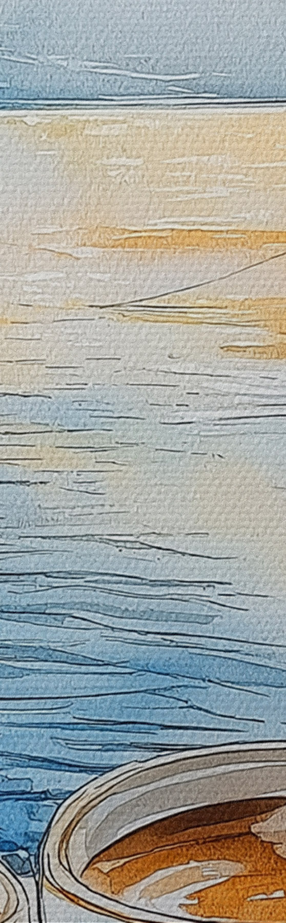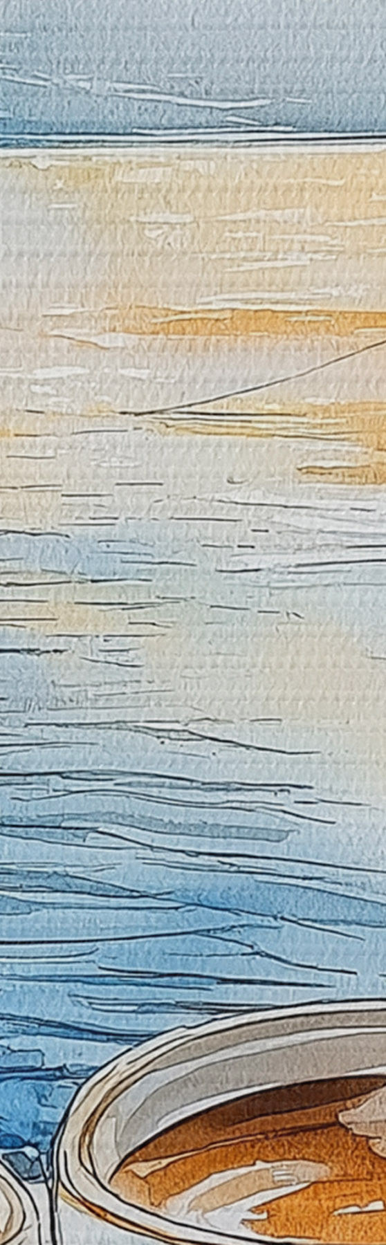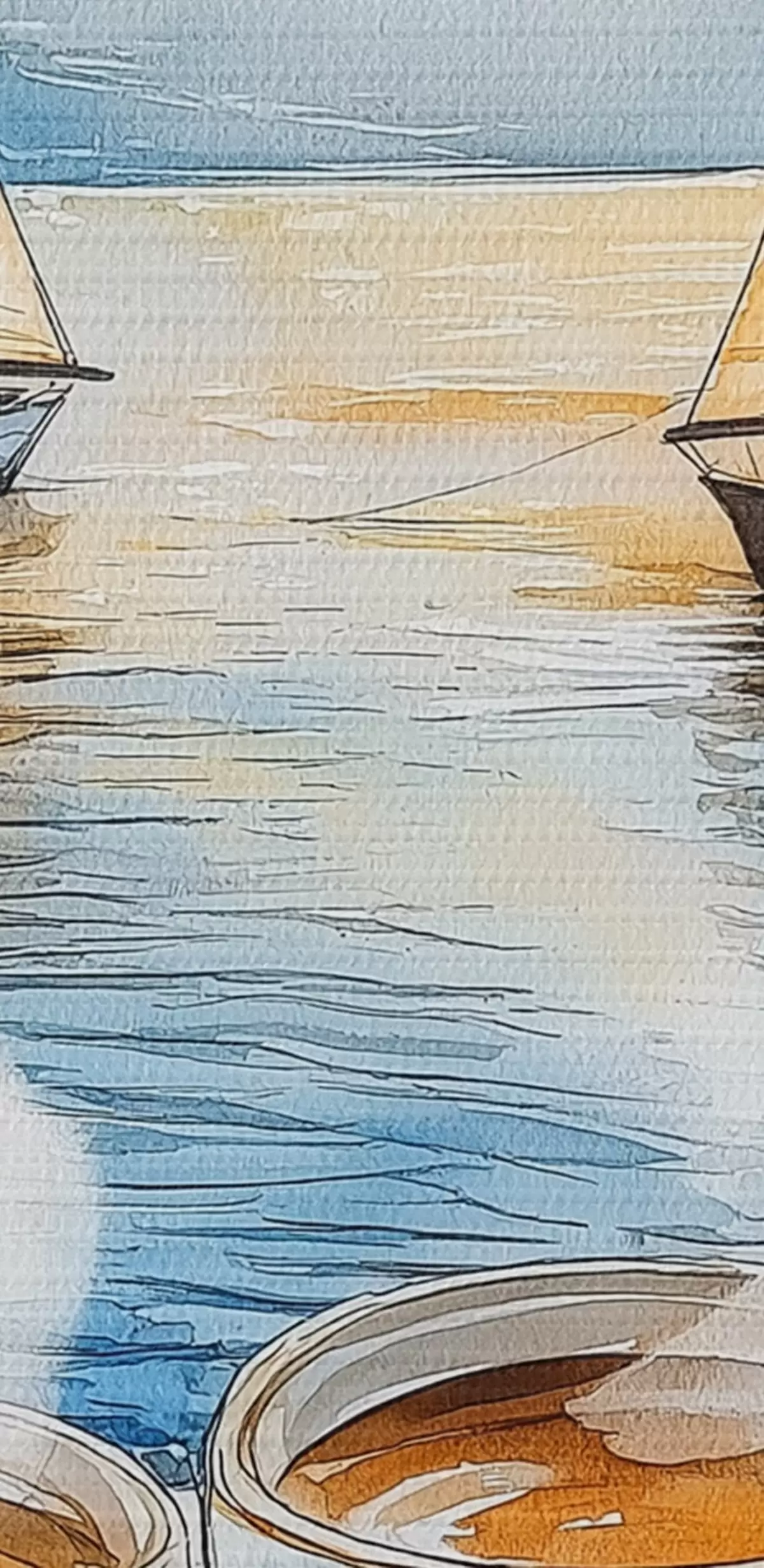 Peinture Coucher de soleil sur le lac, voiliers, tasses de café, style aquarelle Art. s42442