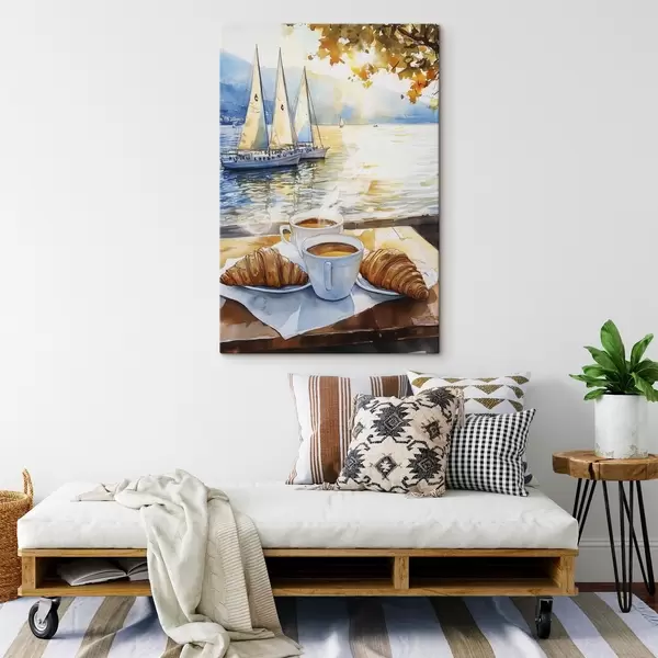 Peinture Tasses de café, couleurs du coucher de soleil, lac, voiliers, nature, voyage Art. s42443