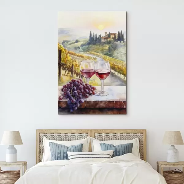 Peintures Coucher de soleil en Toscane, vignoble, architecture ancienne, aquarelle, Italie s42446
