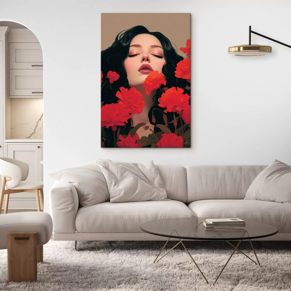 Peinture Portrait de femme parmi des fleurs rouges Art. s42478