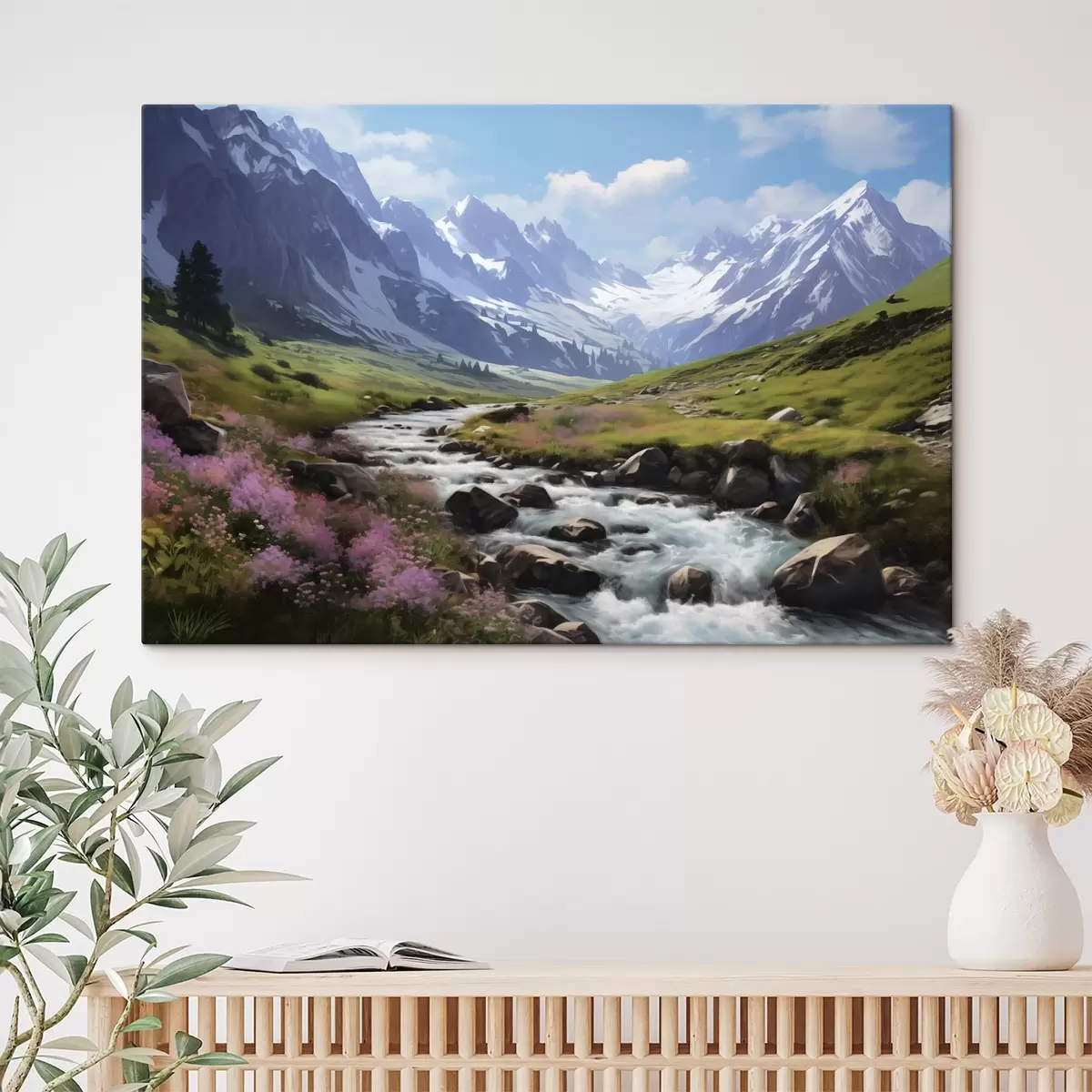 Peintures Un paysage de montagne avec un ruisseau qui coule, des prairies en fleurs et des sommets enneigés à l'horizon sous un ciel d'un bleu éclatant. s42563