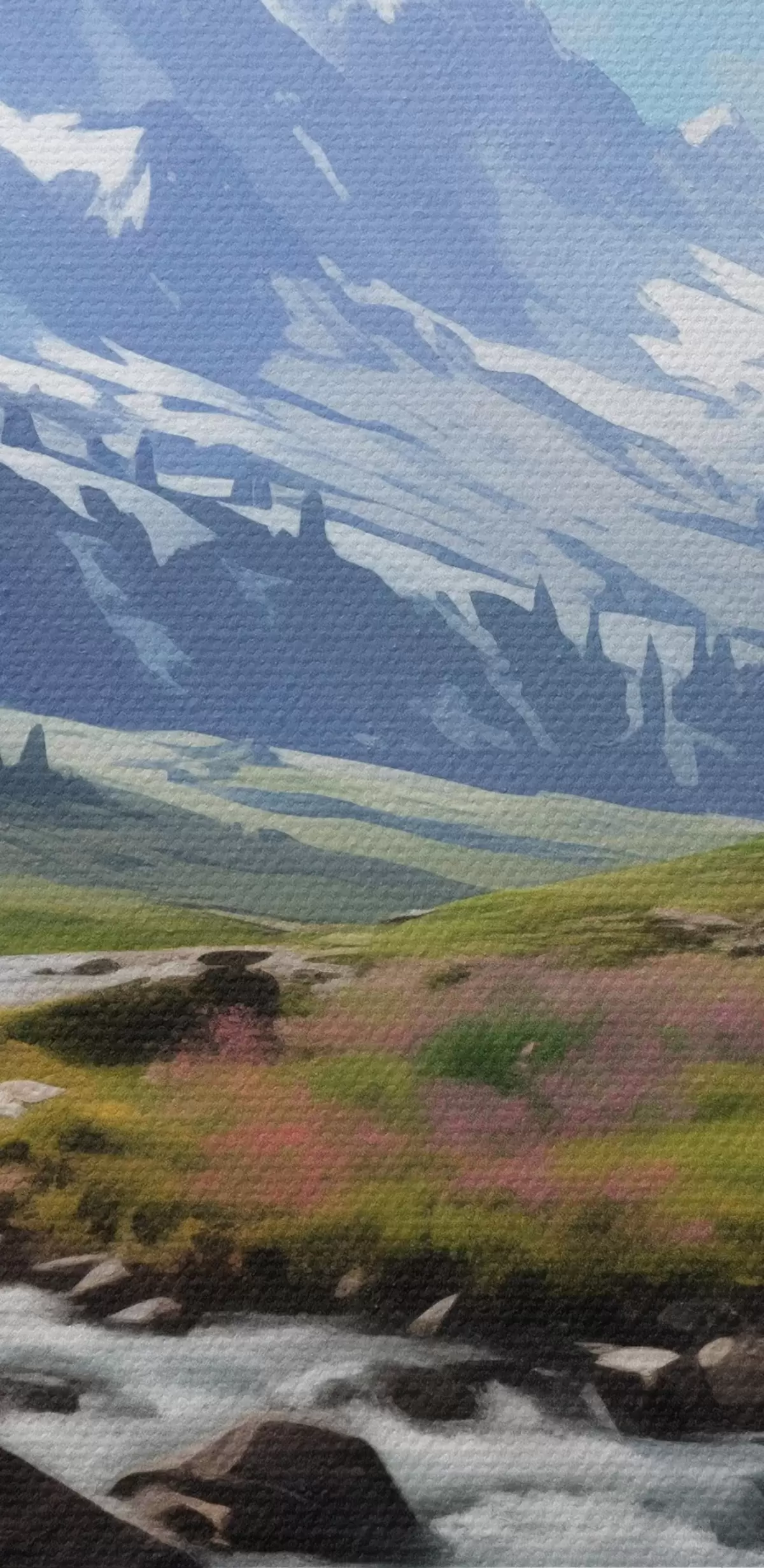 Peinture Un paysage de montagne avec un ruisseau qui coule, des prairies en fleurs et des sommets enneigés à l'horizon sous un ciel d'un bleu éclatant. Art. s42563