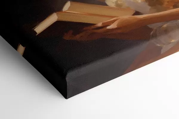 Peinture Une jeune femme vêtue d'une robe élégante lisant un livre dans un éclairage d'ambiance, entourée d'étagères et de la douce lueur de bougies. Art. s42570