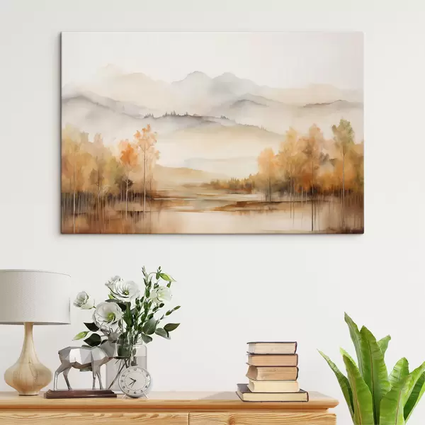Peinture Paysage composé de montagnes douces, d'un lac calme reflétant le paysage et d'arbres au feuillage orangé Art. s42716