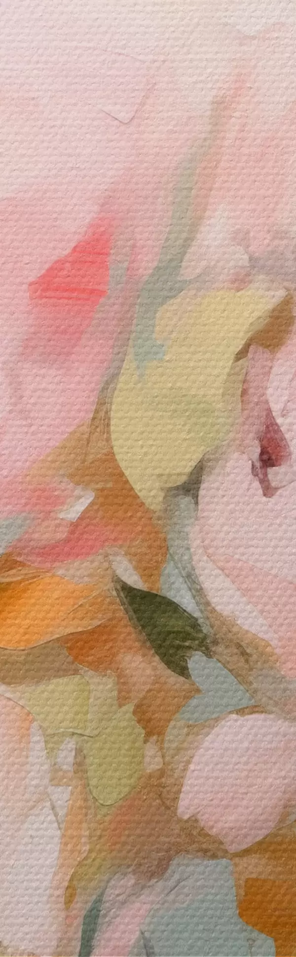 Peinture Peinture à l'huile imitant de grandes pivoines roses aux pétales souples et aux centres jaunes, entourées de feuilles vertes Art. s42720