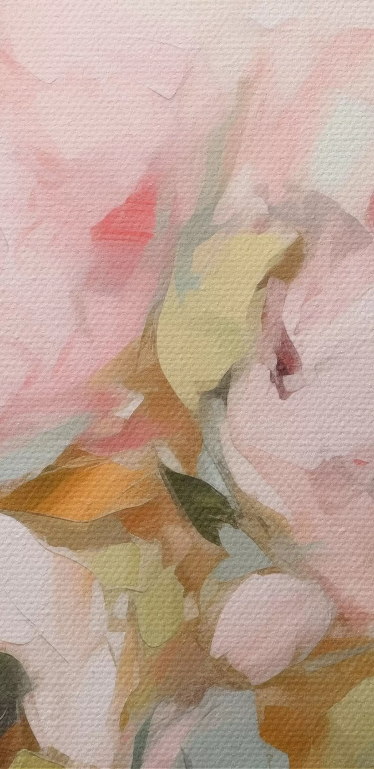 Peinture Peinture à l'huile imitant de grandes pivoines roses aux pétales souples et aux centres jaunes, entourées de feuilles vertes Art. s42720