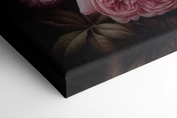 Peinture Roses roses et blanches arrangées avec des fleurs blanches délicates et des feuilles vertes sur un fond sombre Art. s42721