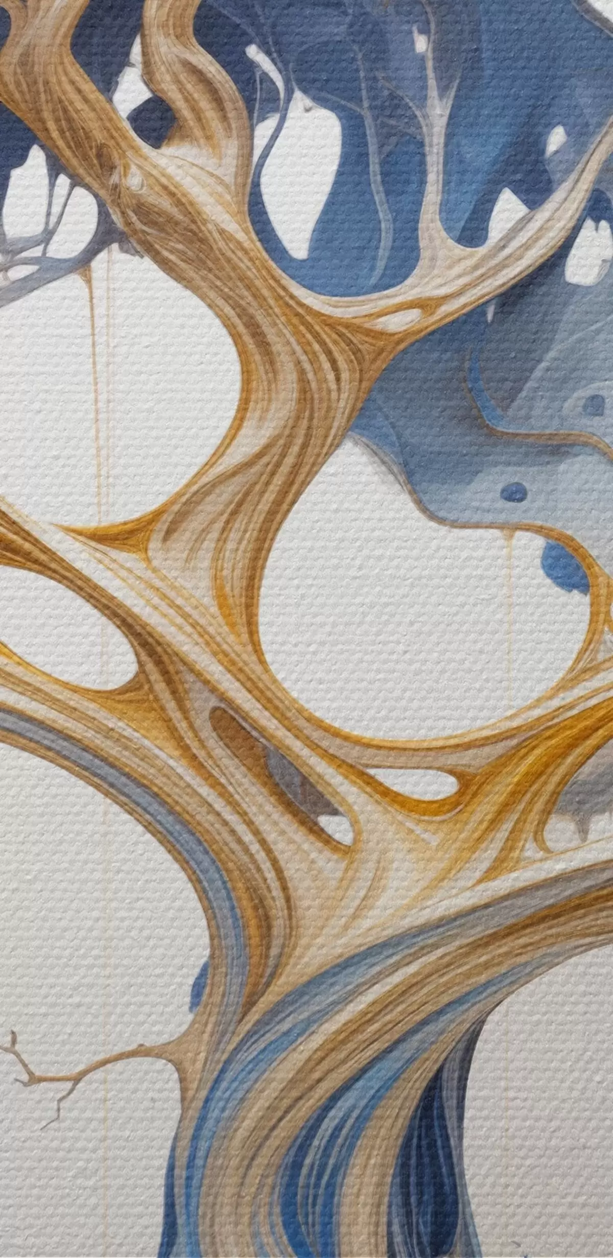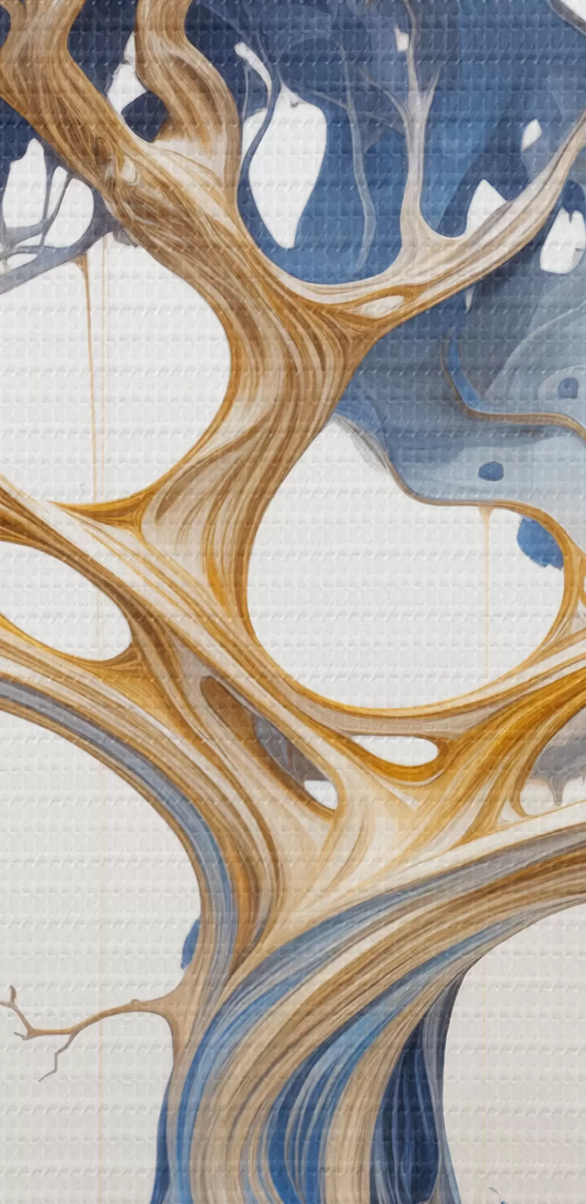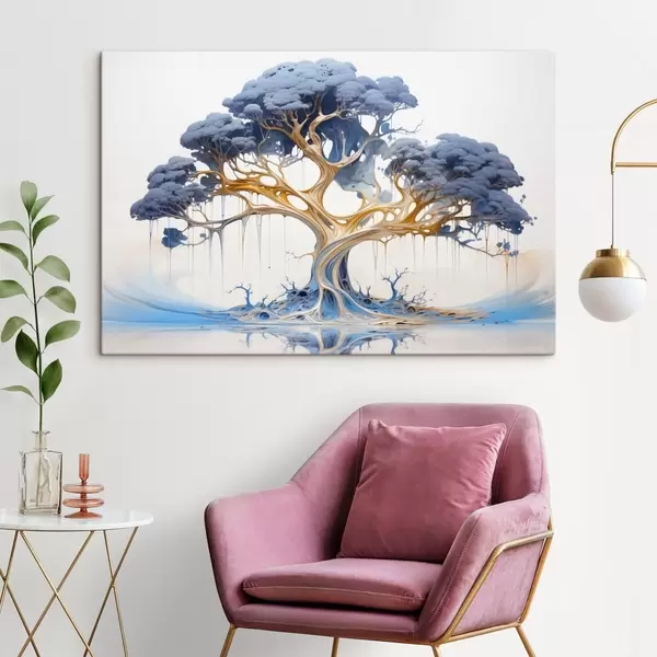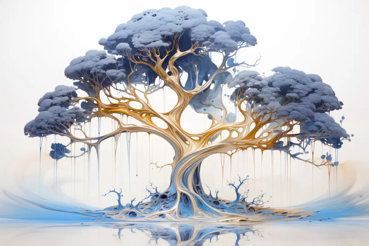 Peinture Un arbre stylisé aux branches et au feuillage complexes, avec un mélange de teintes bleues et jaunes Art. s42722