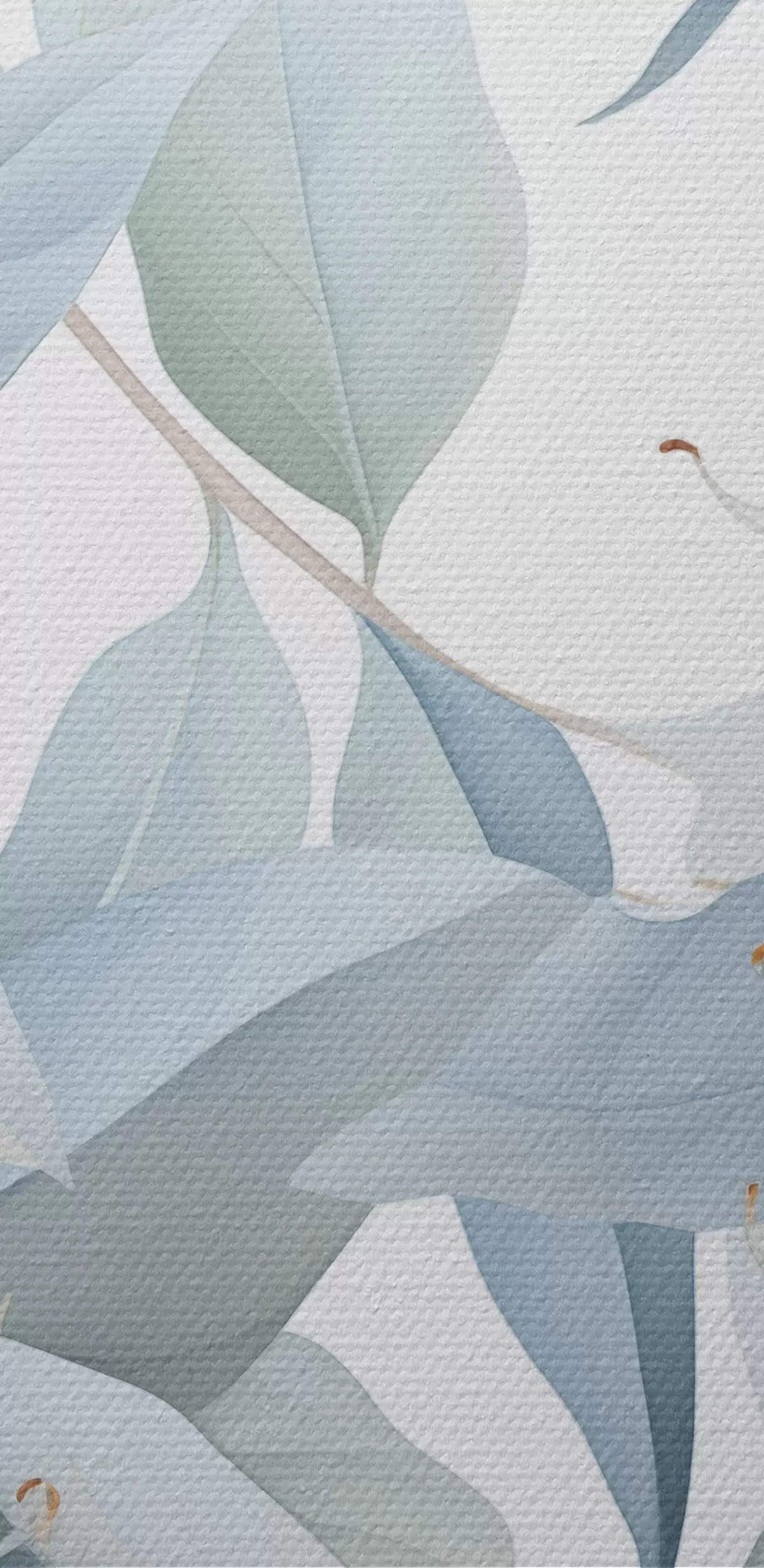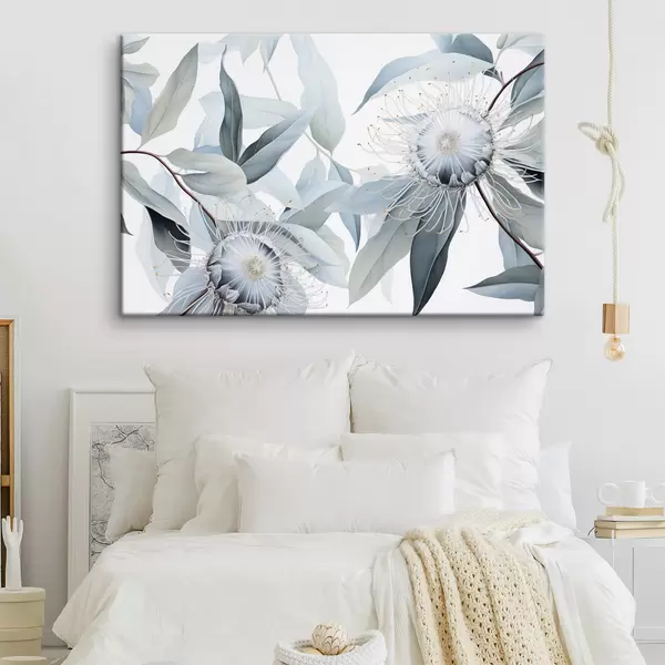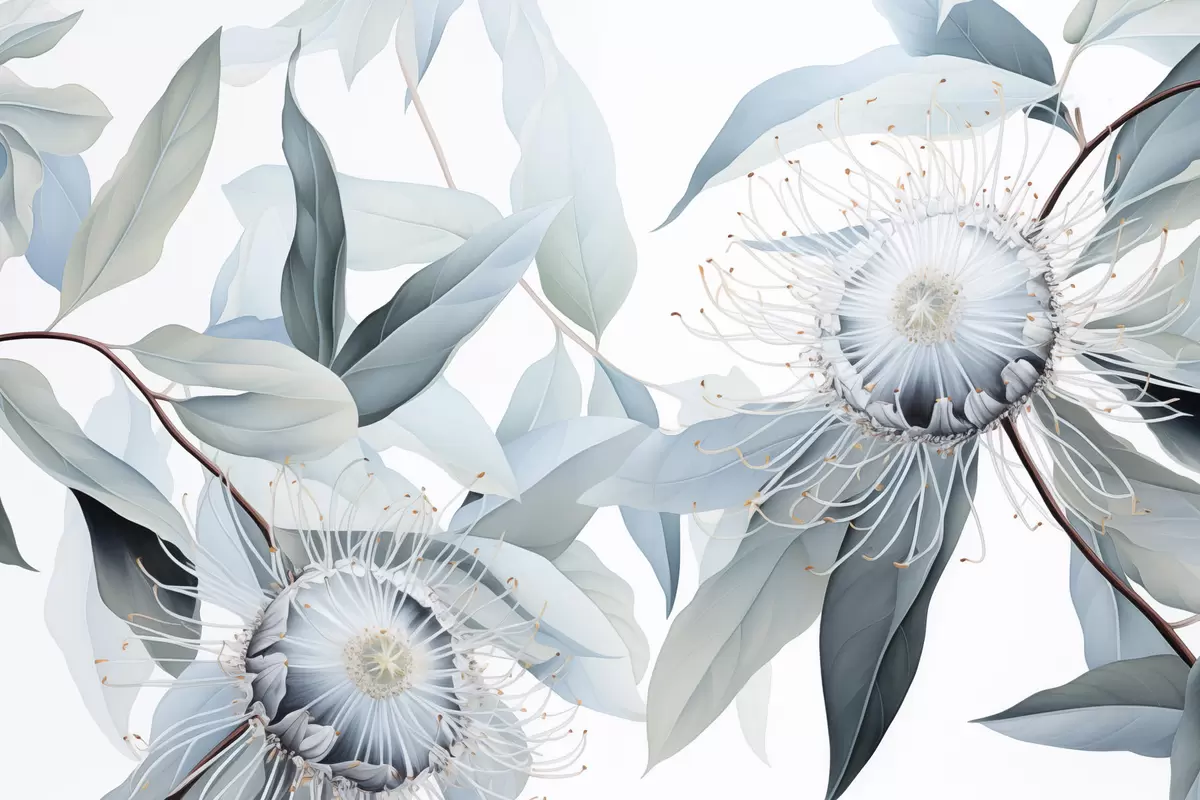 Peinture Illustration botanique détaillée de fleurs d'eucaliptus aux filaments blancs, entourées de feuilles vertes douces et légères Art. s42725