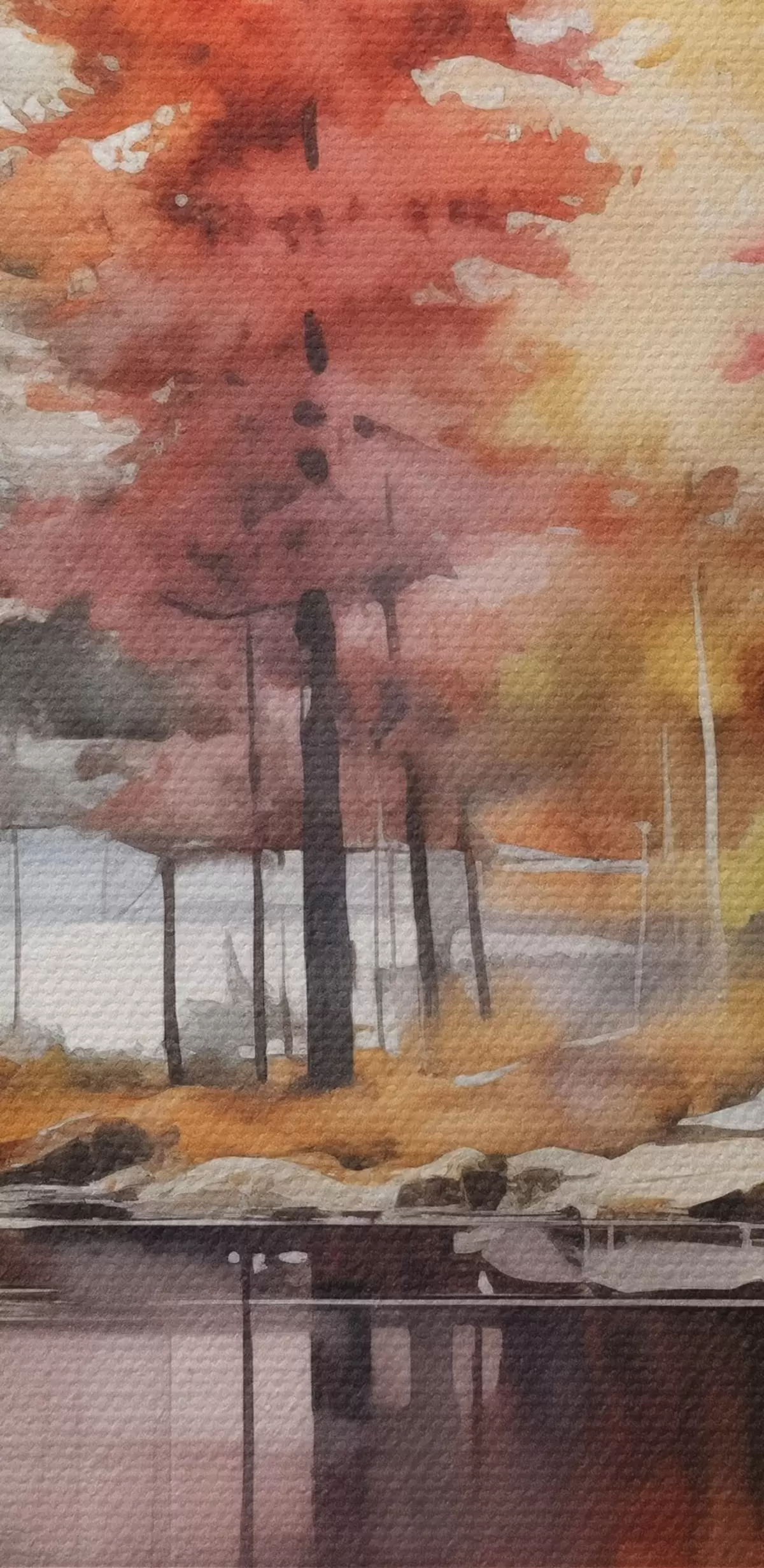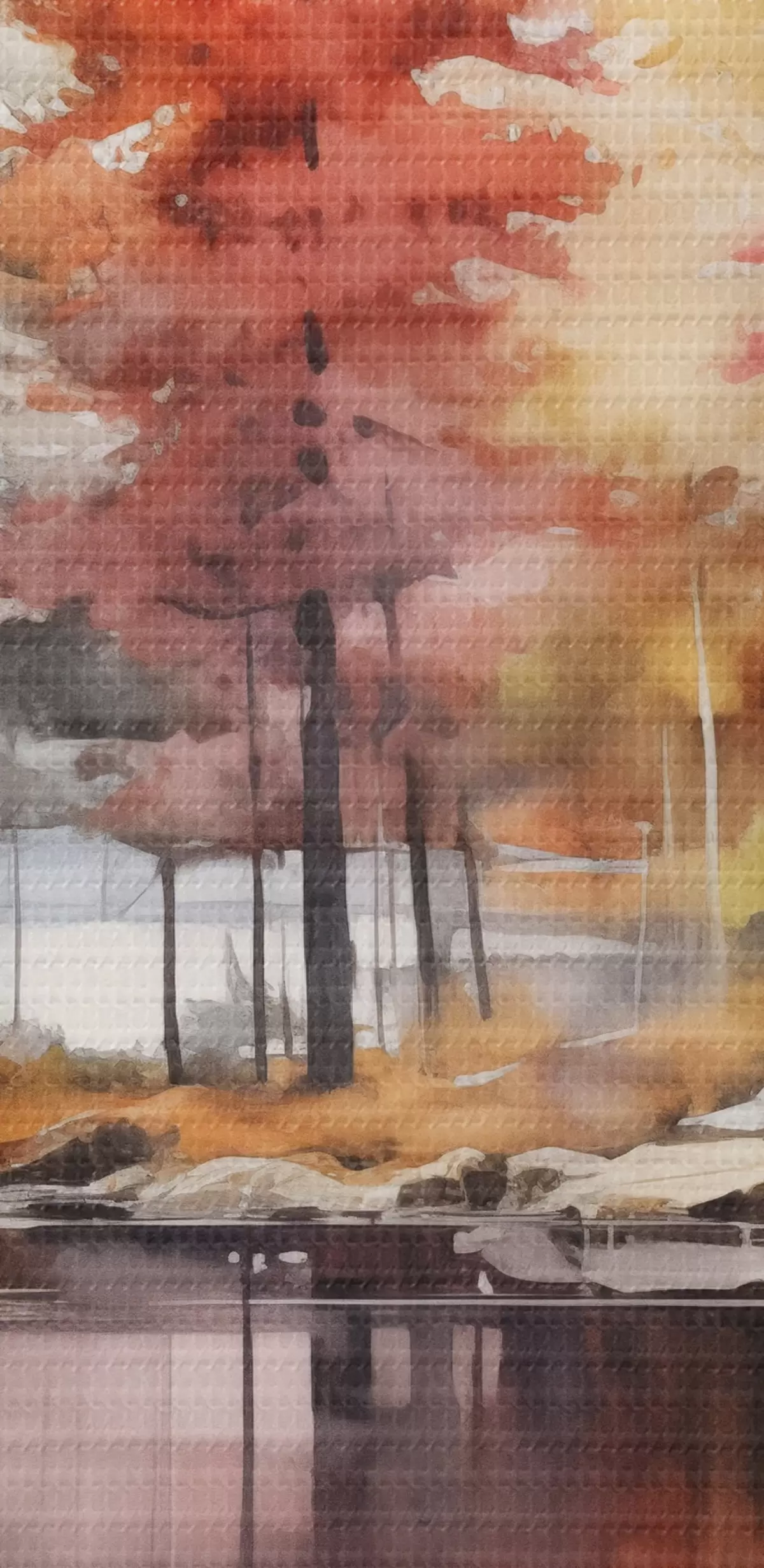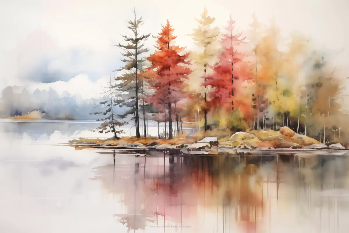 Peinture Paysage de type aquarelle avec un lac entouré d'arbres aux couleurs d'automne éclatantes Art. s42727