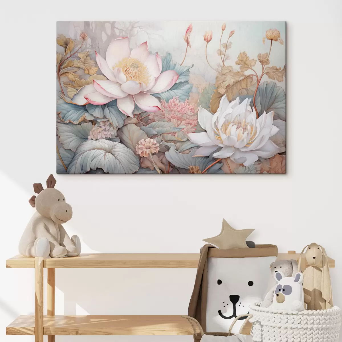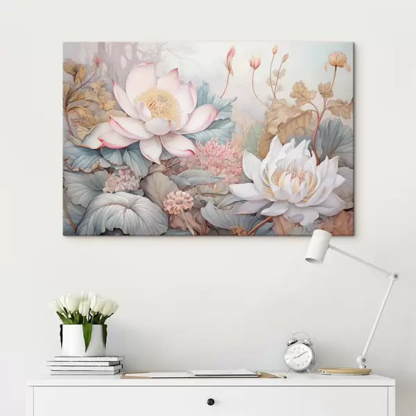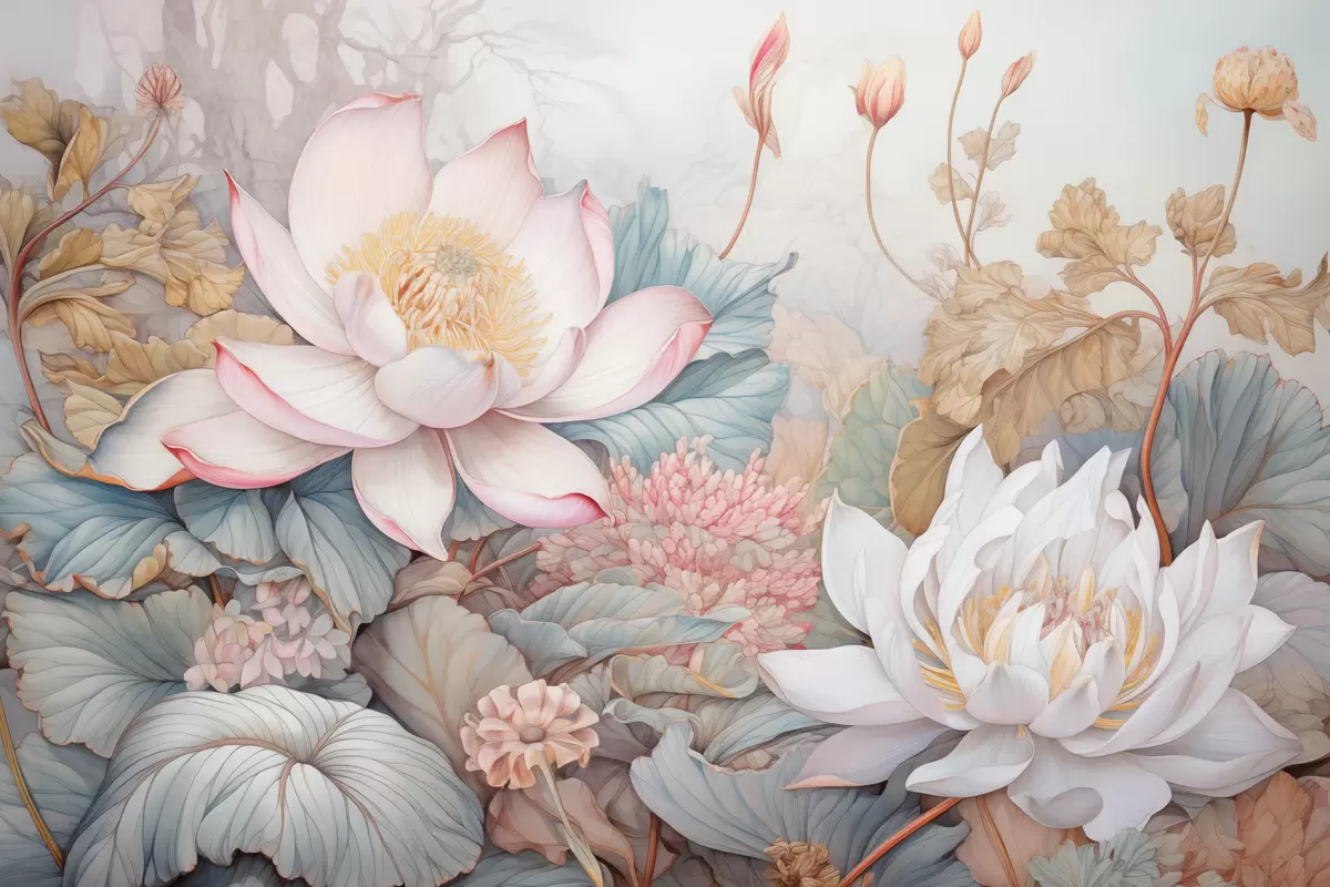 Peinture Grandes fleurs de lotus épanouies dans des tons doux de rose et de blanc, entourées de feuilles vertes et d'un délicat feuillage rose Art. s42729
