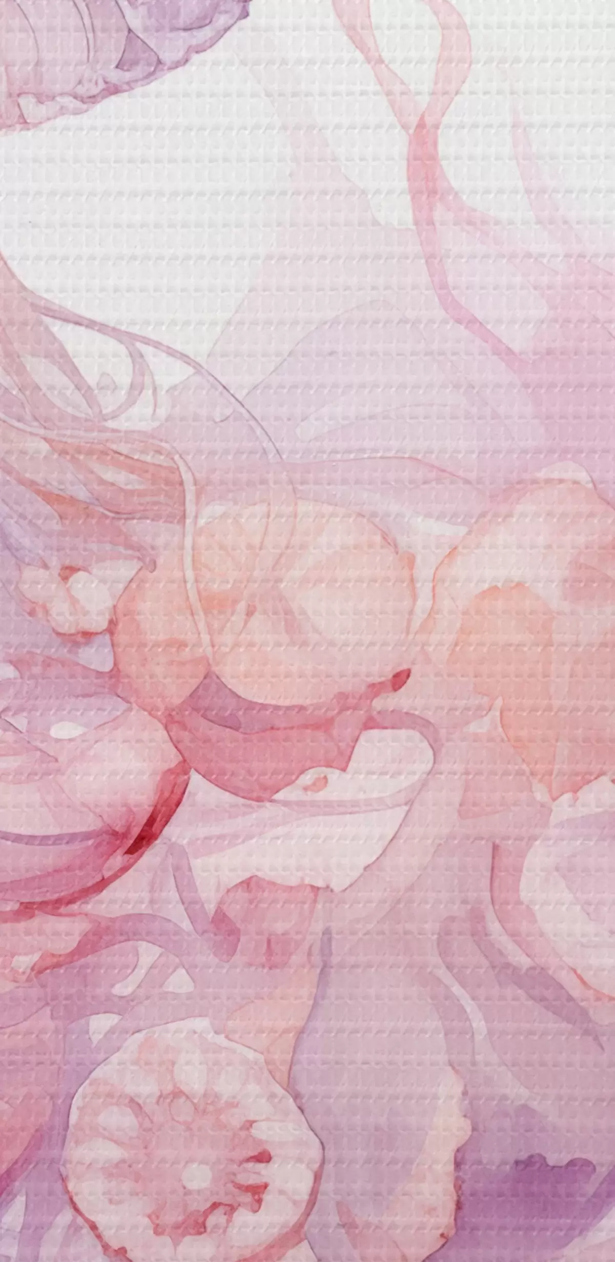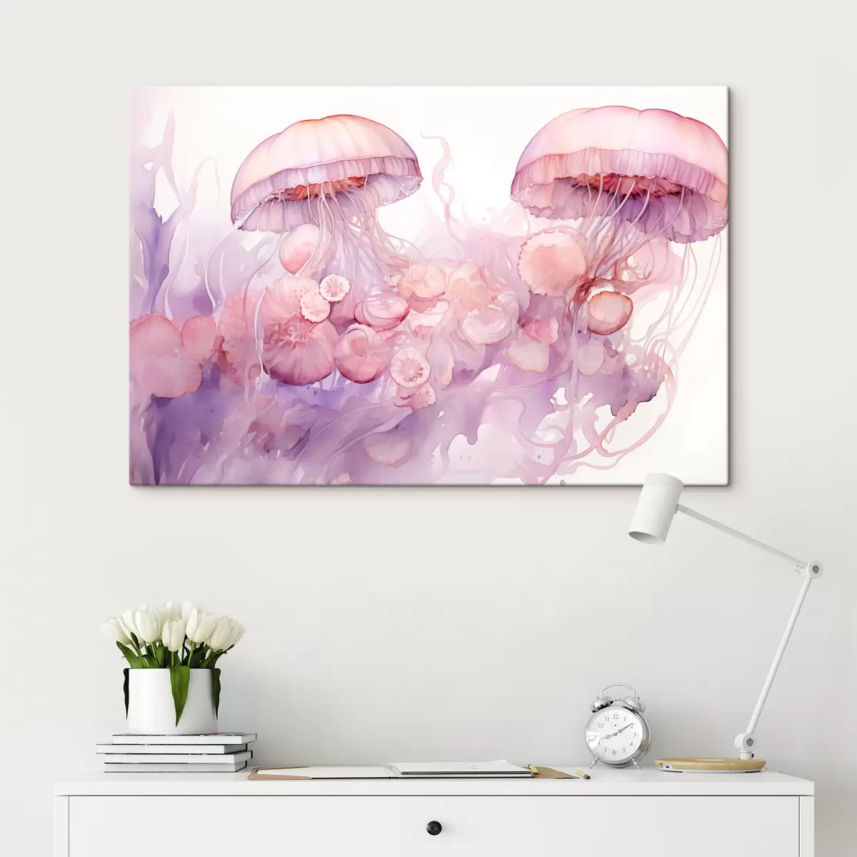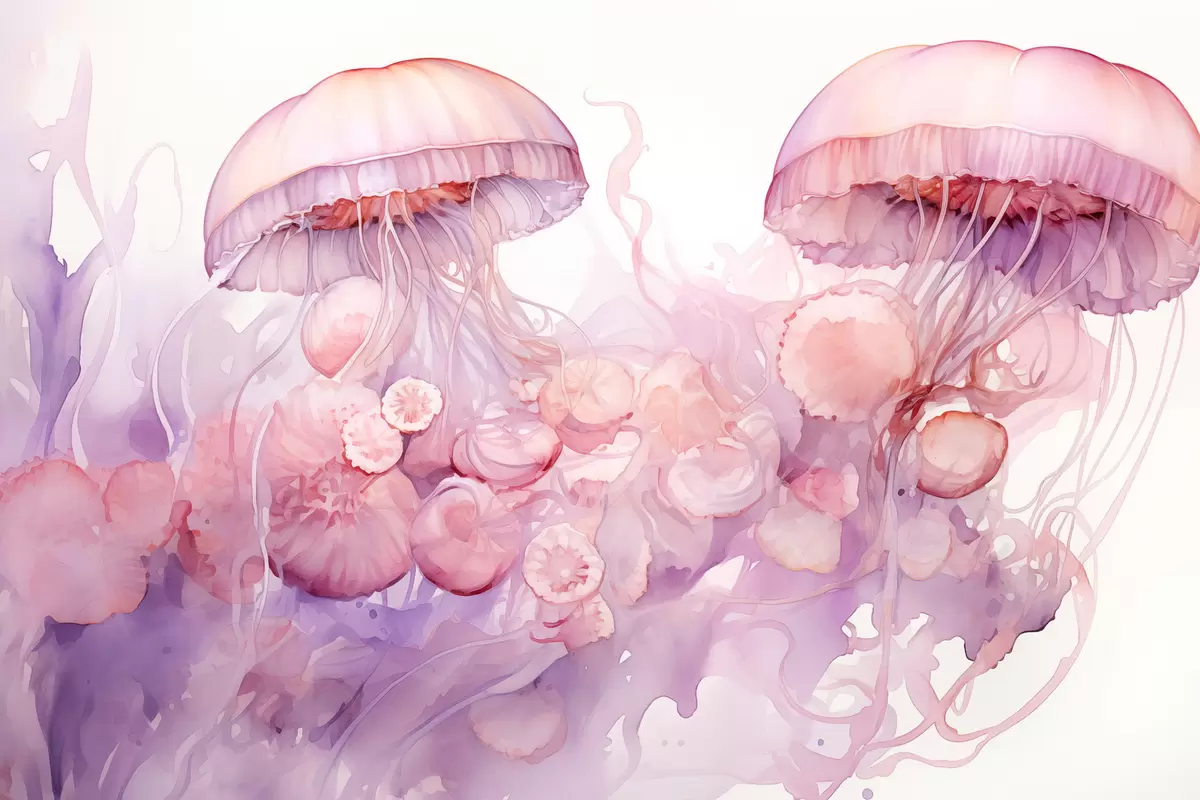 Peintures Méduse rose flottant au milieu d'un tourbillon de teintes roses et violettes, entourée de formes abstraites s42730