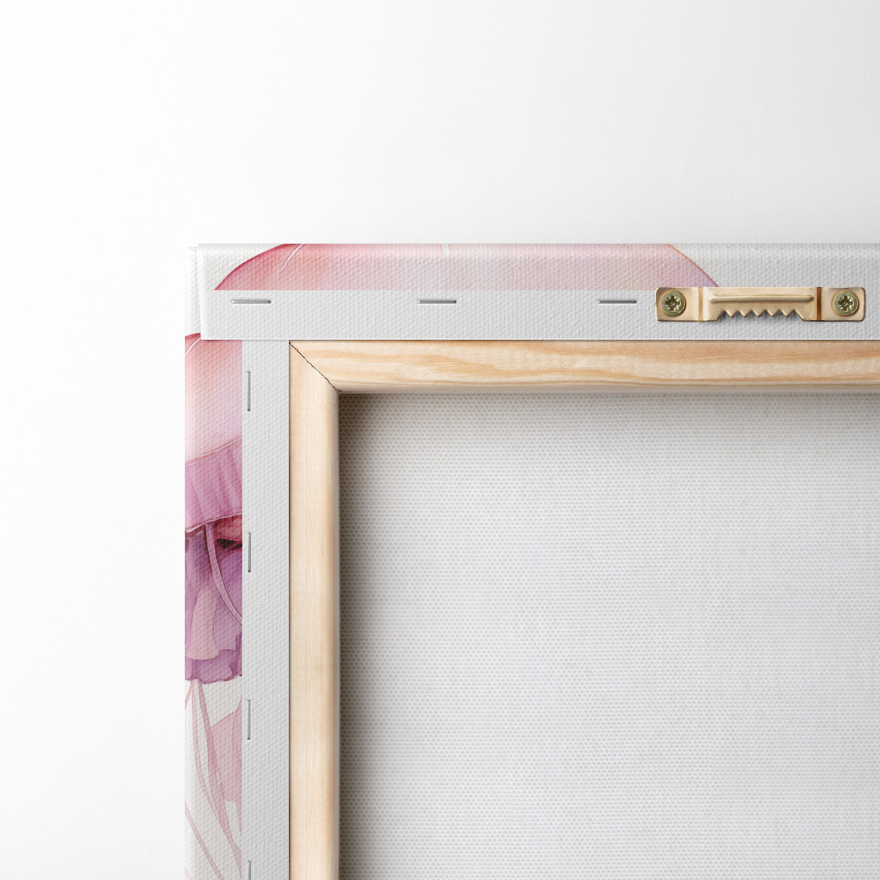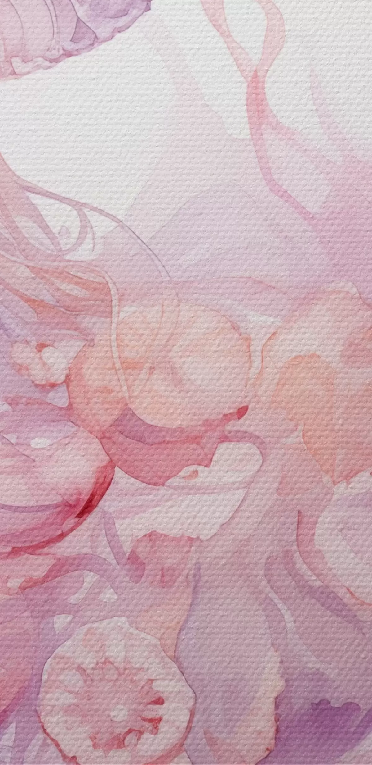 Peinture Méduse rose flottant au milieu d'un tourbillon de teintes roses et violettes, entourée de formes abstraites Art. s42730