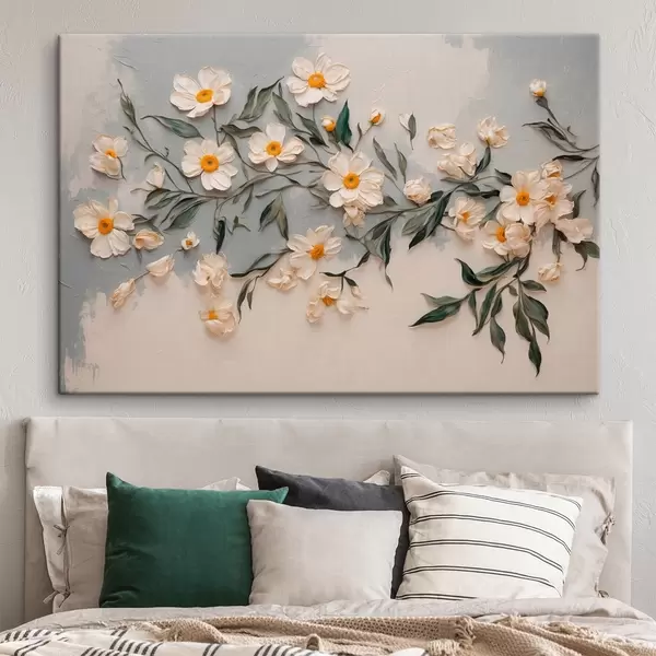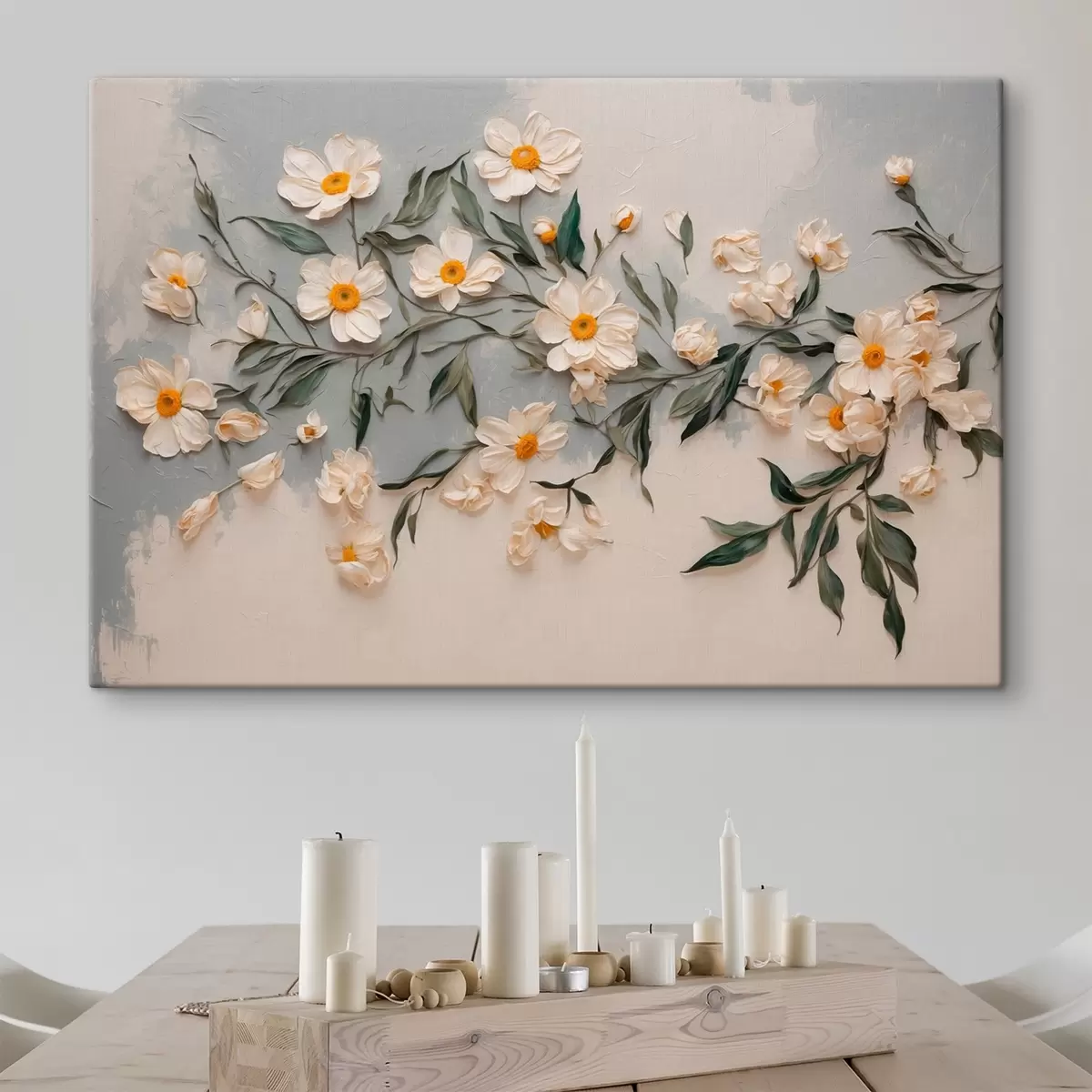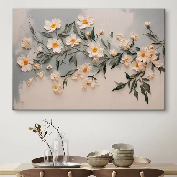 Peinture Fleurs et feuilles blanches sur fond blanc et gris Art. s42764