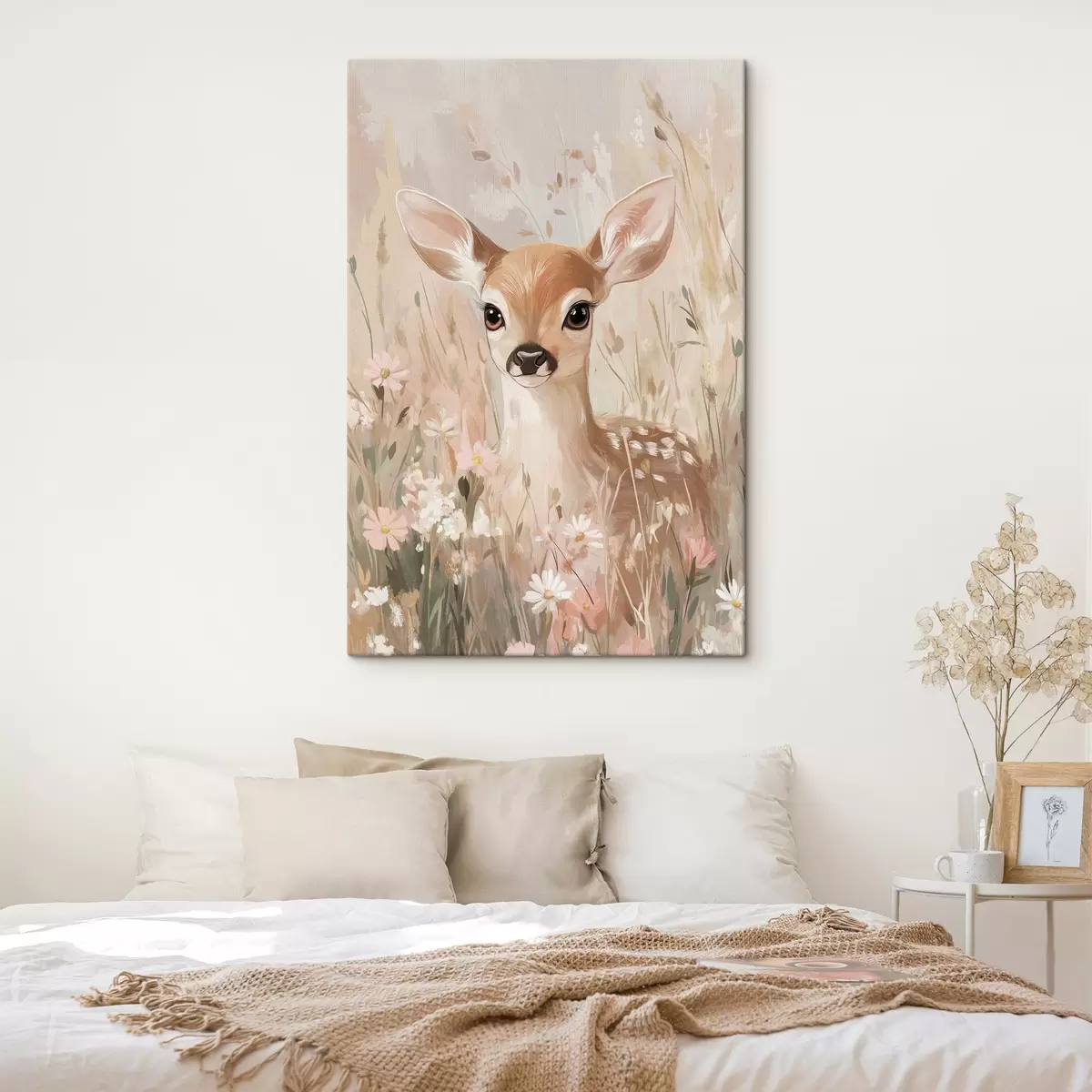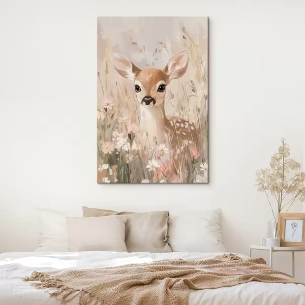 Peintures Petit cerf dans la prairie d'été, dessin à l'acrylique, couleurs rose pastel et beige s42781