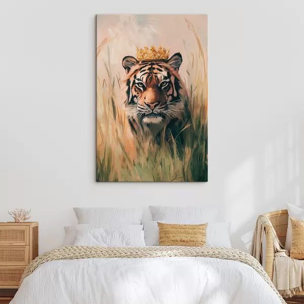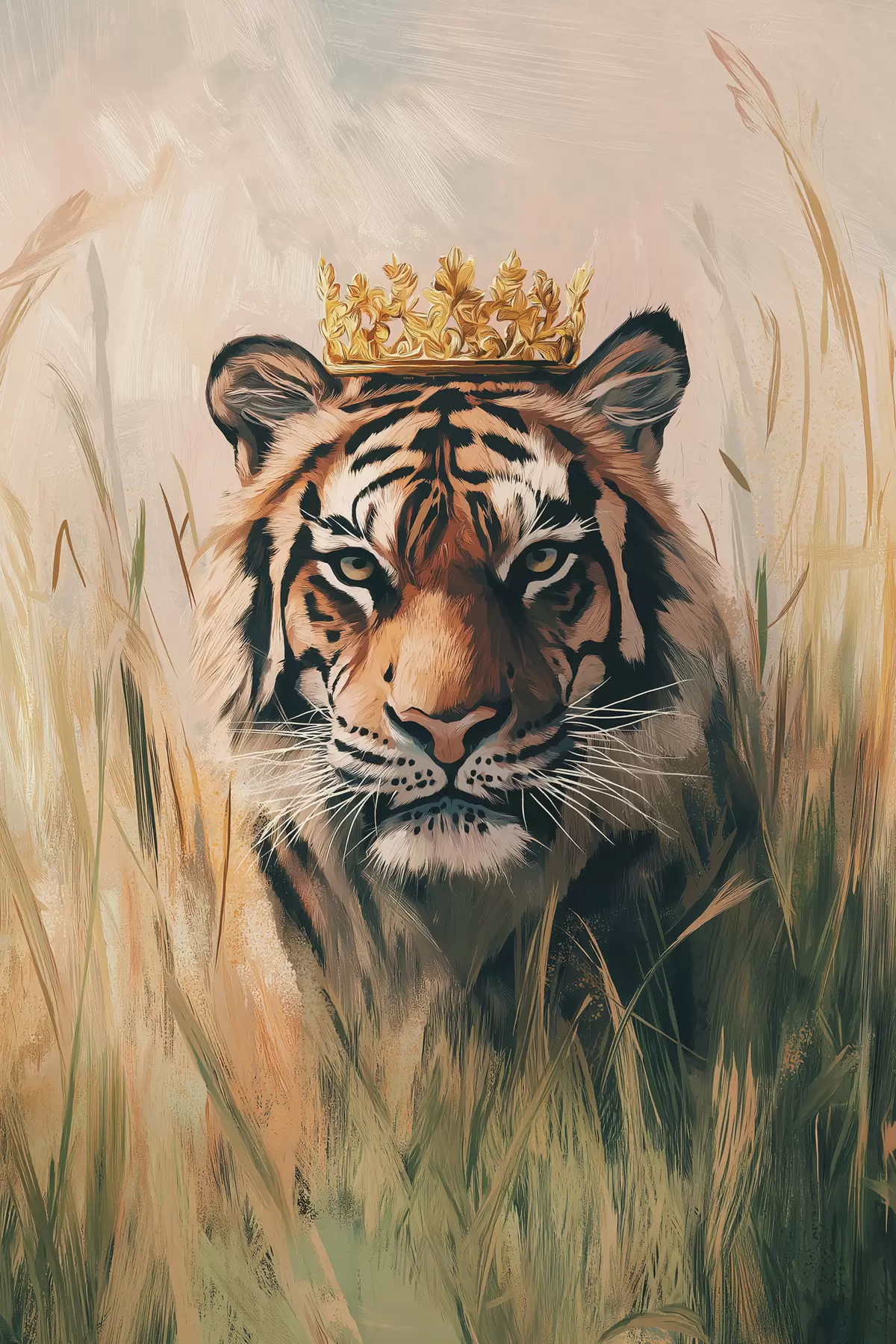 Peinture Tigre dans un pré avec de l'herbe, couronne, dessin à l'acrylique Art. s42783