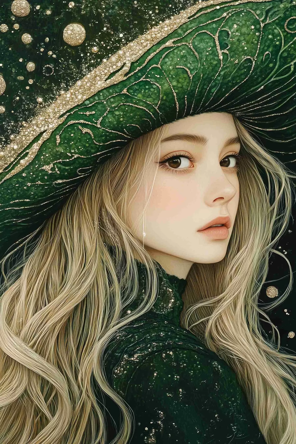 Peinture Portrait d'une jeune fille avec un chapeau vert Art. s42982
