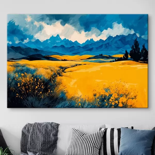 Peinture Champ jaune sur fond de montagnes dans le style de l'aquarelle Art. s43117