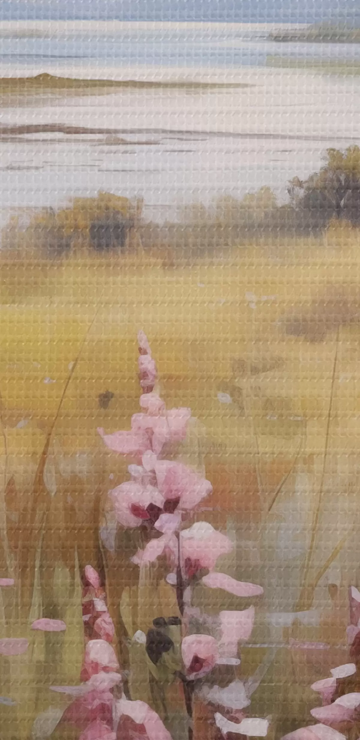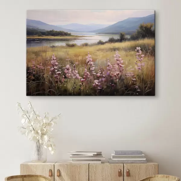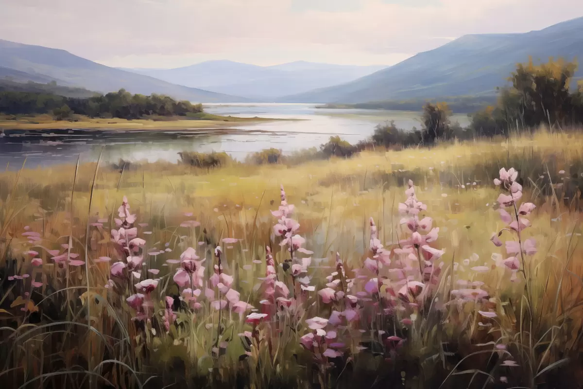 Peinture Paysage avec un champ de fleurs roses, un lac et des montagnes en arrière-plan, sous un ciel nuageux Art. s43165