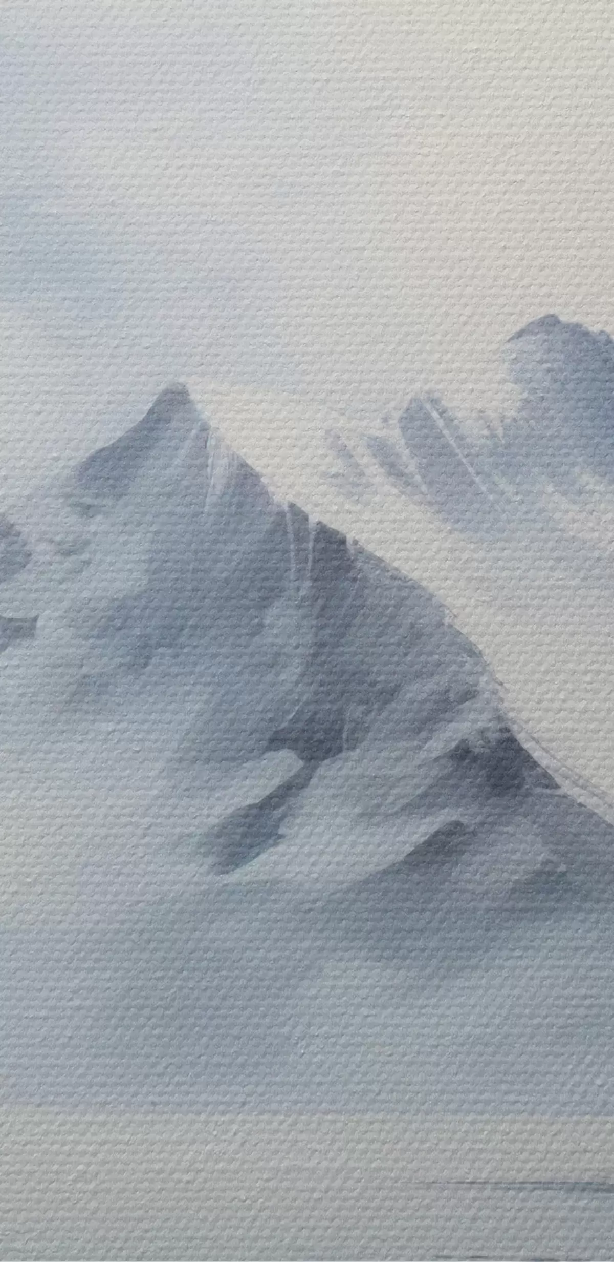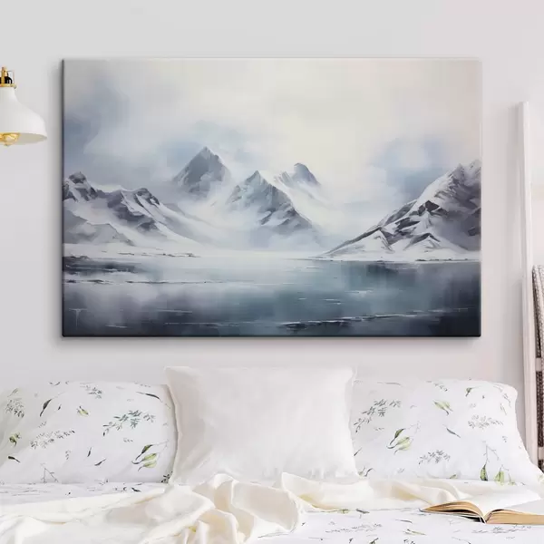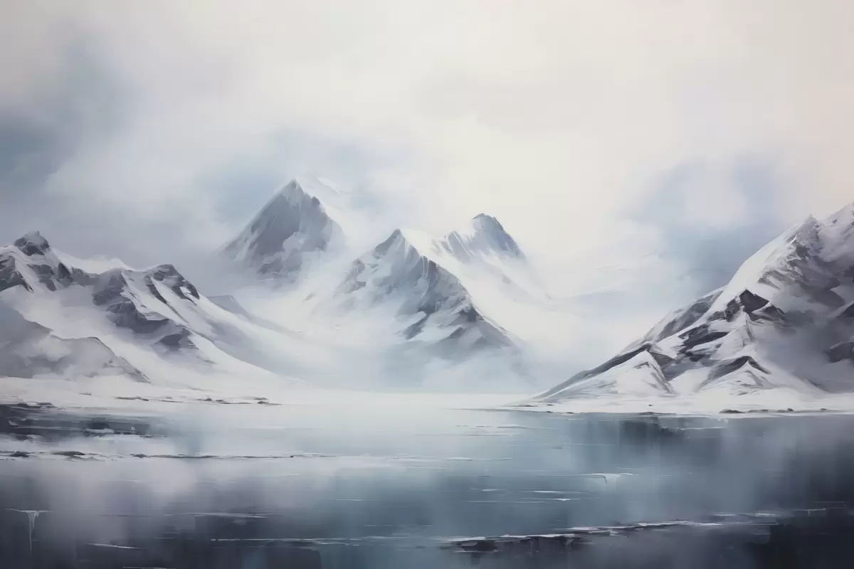Peinture Paysage de montagnes enneigées avec un lac au premier plan, les sommets sont couverts de neige et le ciel est nuageux Art. s43174