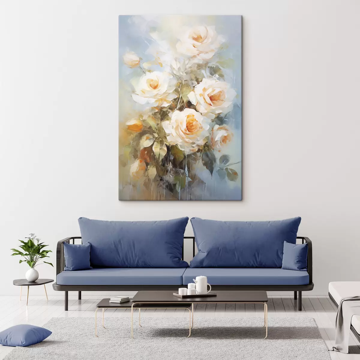 Peinture Roses blanches avec orange, sur un fond bleu clair doux, avec des coups de pinceau visibles et un style pictural Art. s43175