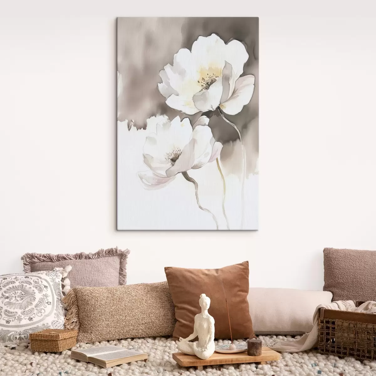 Peinture Fleurs blanches sur fond brun dans le style de l'aquarelle Art. s43297