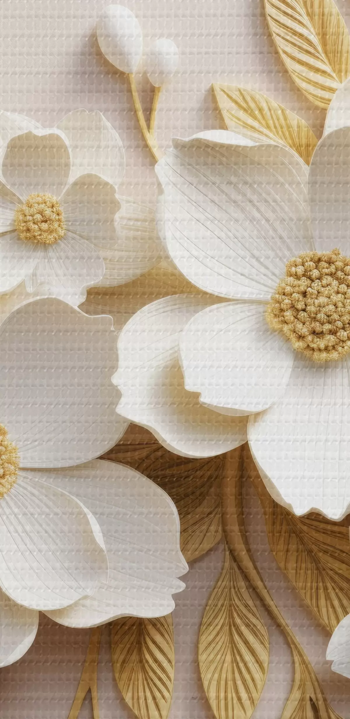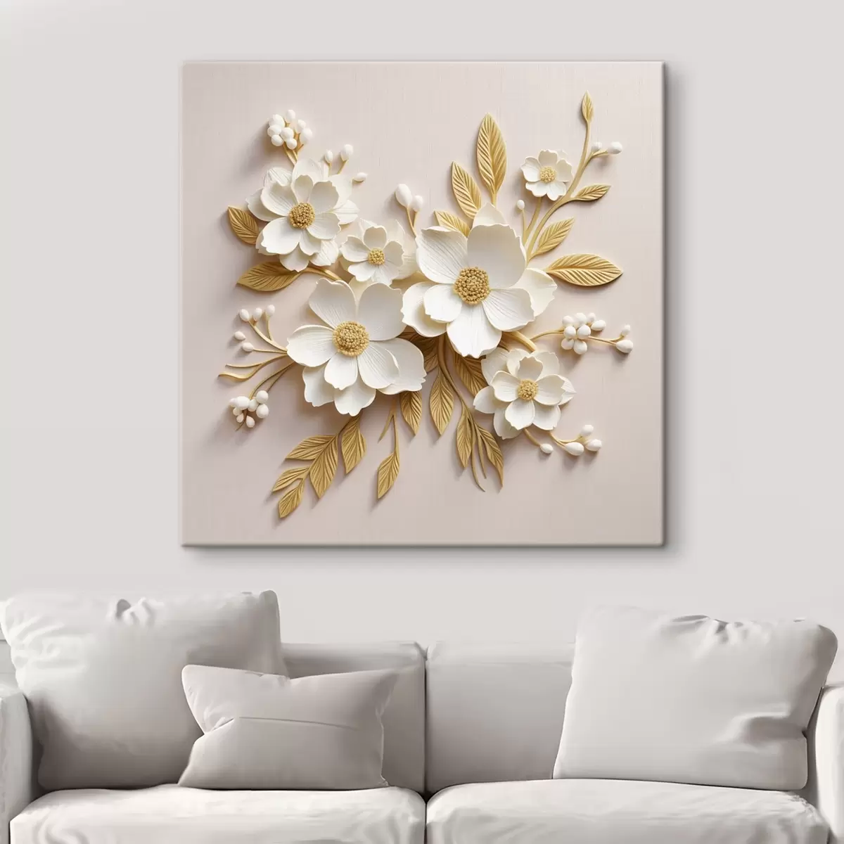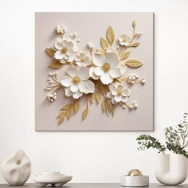 Peinture fleurs blanches en 3D avec des feuilles sur un fond crème Art. s43383