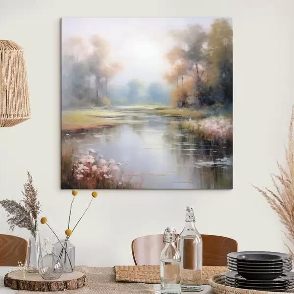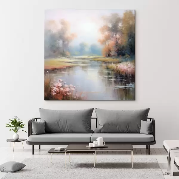 Peinture Forêt naturelle avec une rivière, des fleurs et des arbres Art. s43386