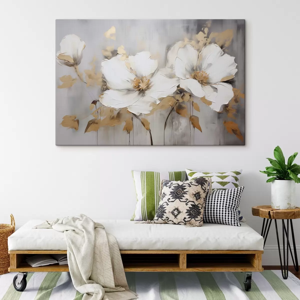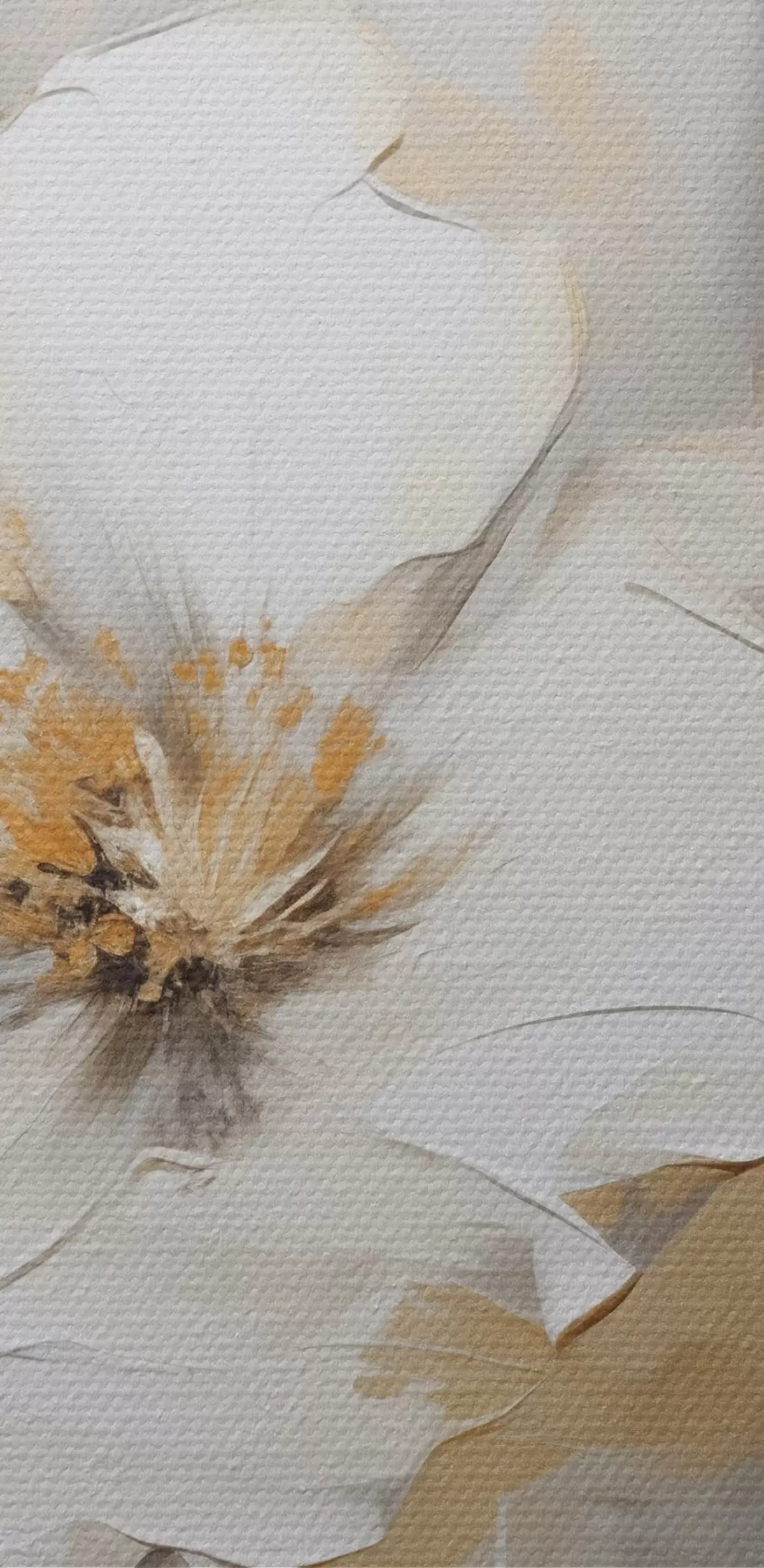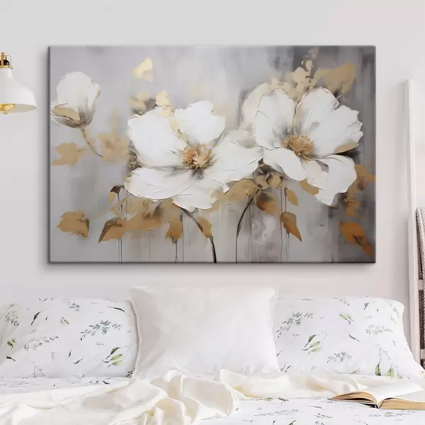 Peintures Fleurs blanches avec feuilles jaunes sur fond blanc, imitation de coups de pinceau épais, style moderne texturé s43389