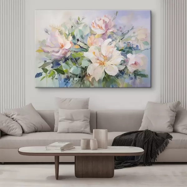 Peinture Arrangement floral composé de fleurs aux couleurs pastel et de feuilles bleues, imitation peinture à l'huile Art. s43390