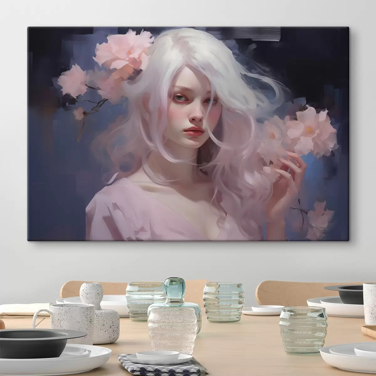 Peintures Fille avec des pivoines, dessin à l'acrylique, fond sombre s43496