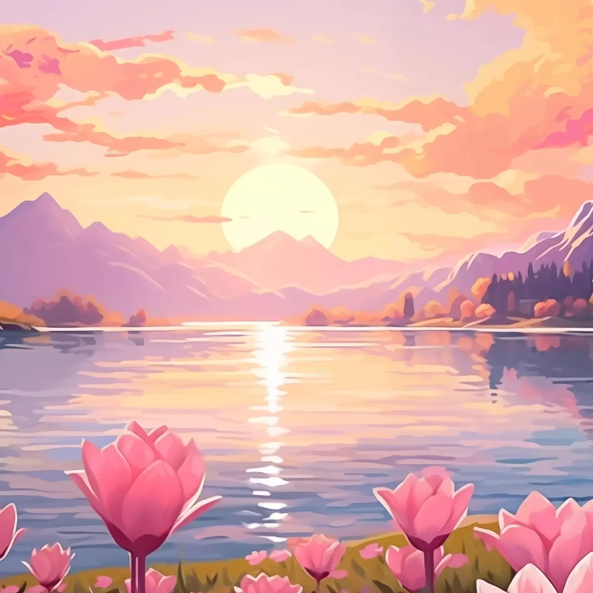 Peinture Paysage avec étang sur fond de montagnes Art. s43523