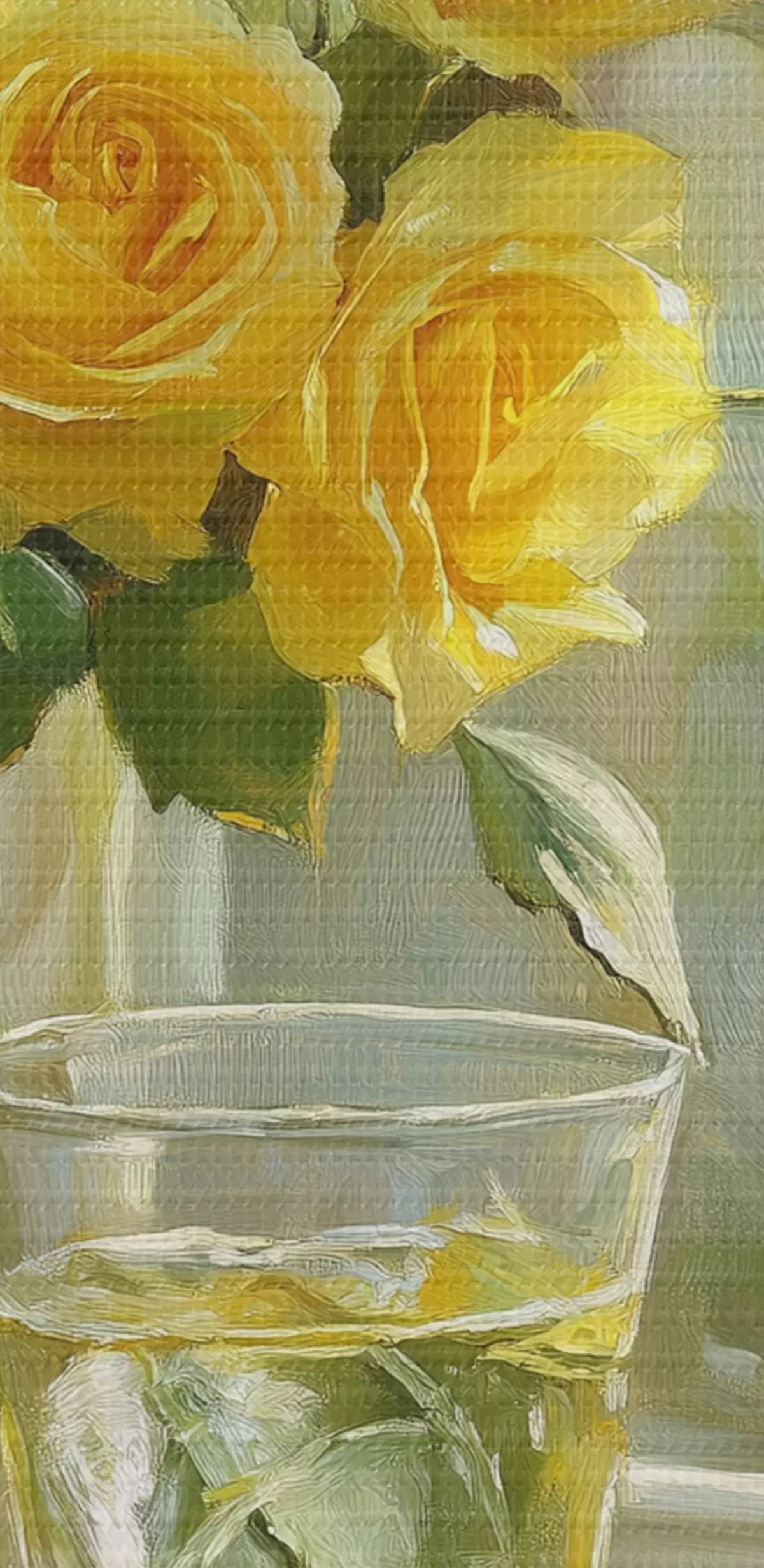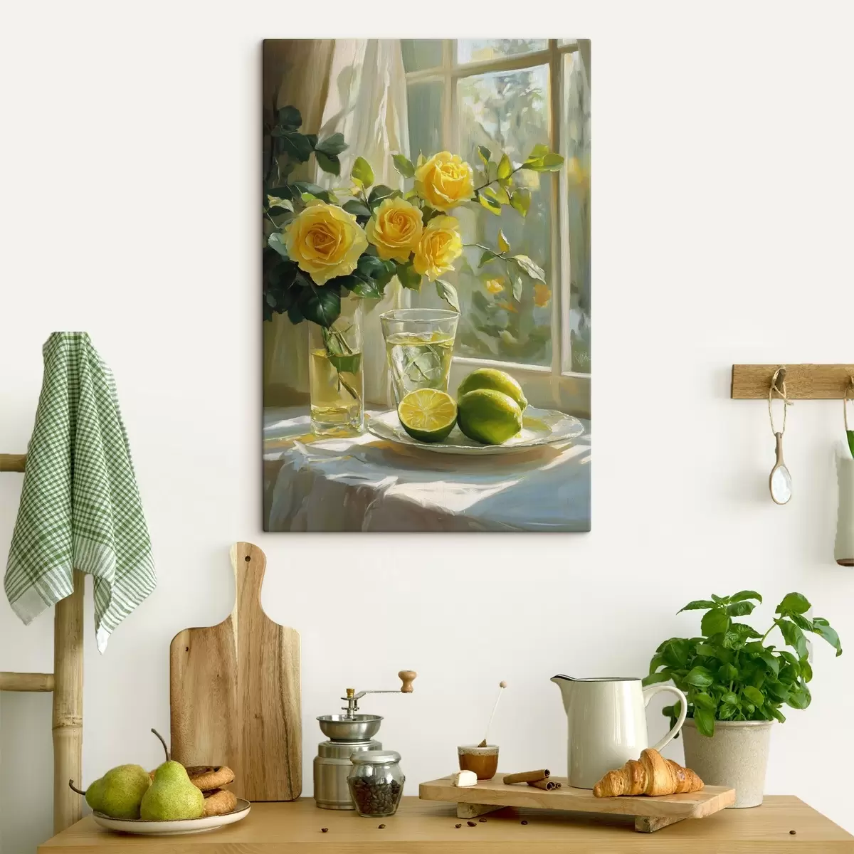 Peinture De belles roses jaunes dans le vase près de la fenêtre, arrosées de citrons verts Art. s43886