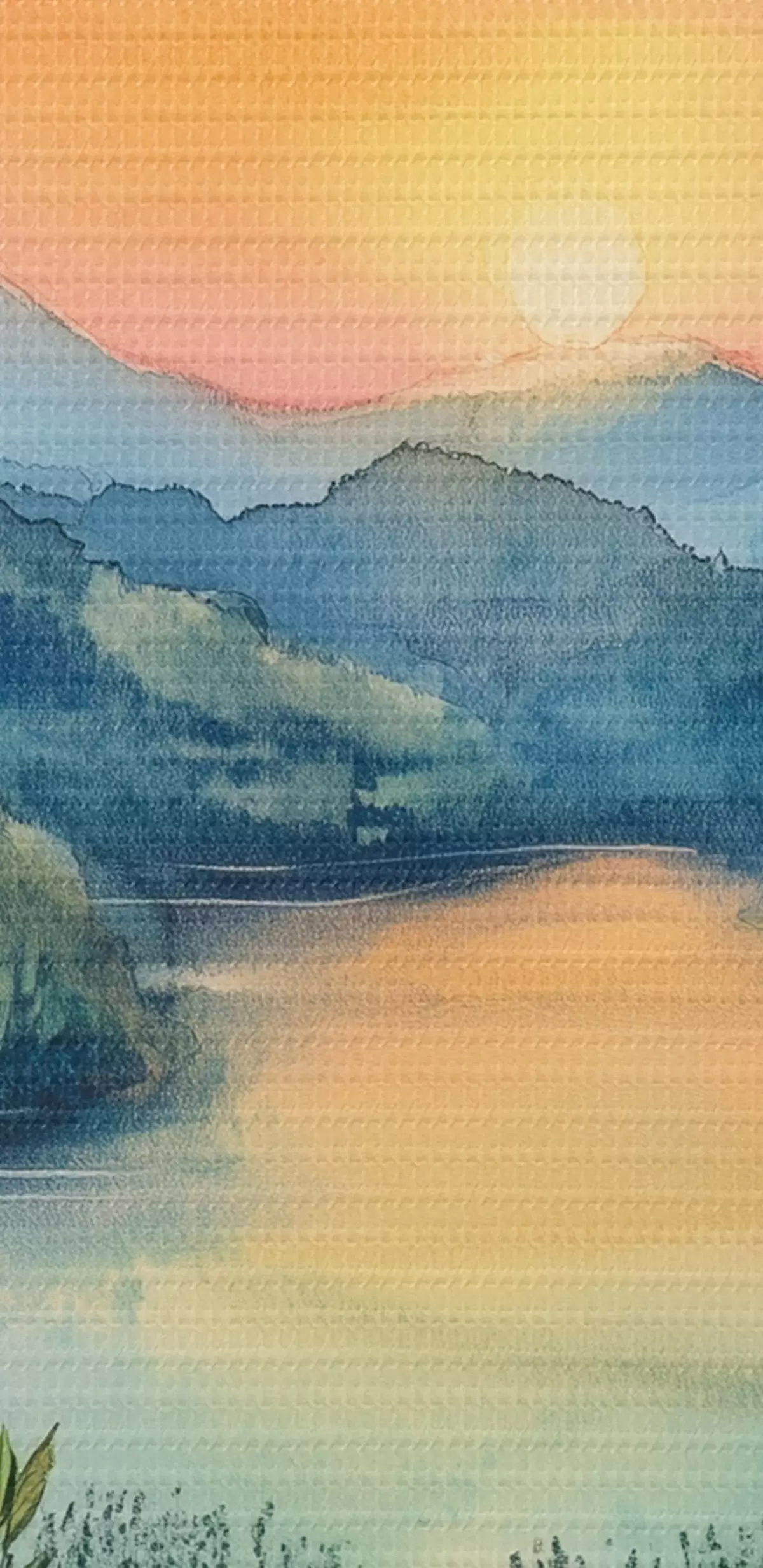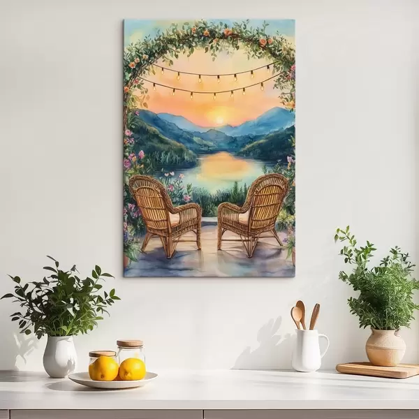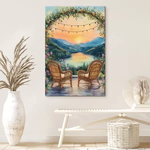 Peinture Chaises en osier au coucher du soleil, paysage de montagne, style boho Art. s44020