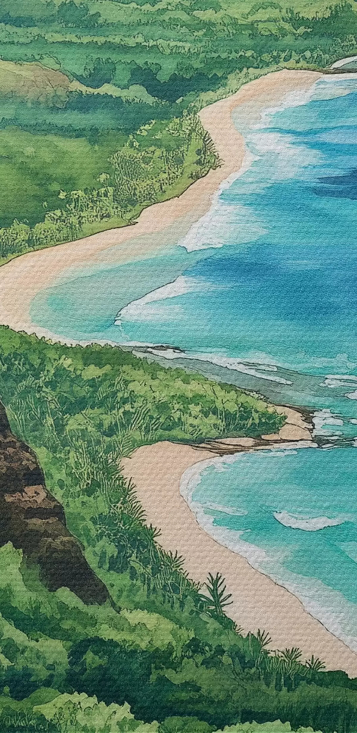 Peintures Montagnes vertes, Hawaï, océan, tropical, aquarelle s44143