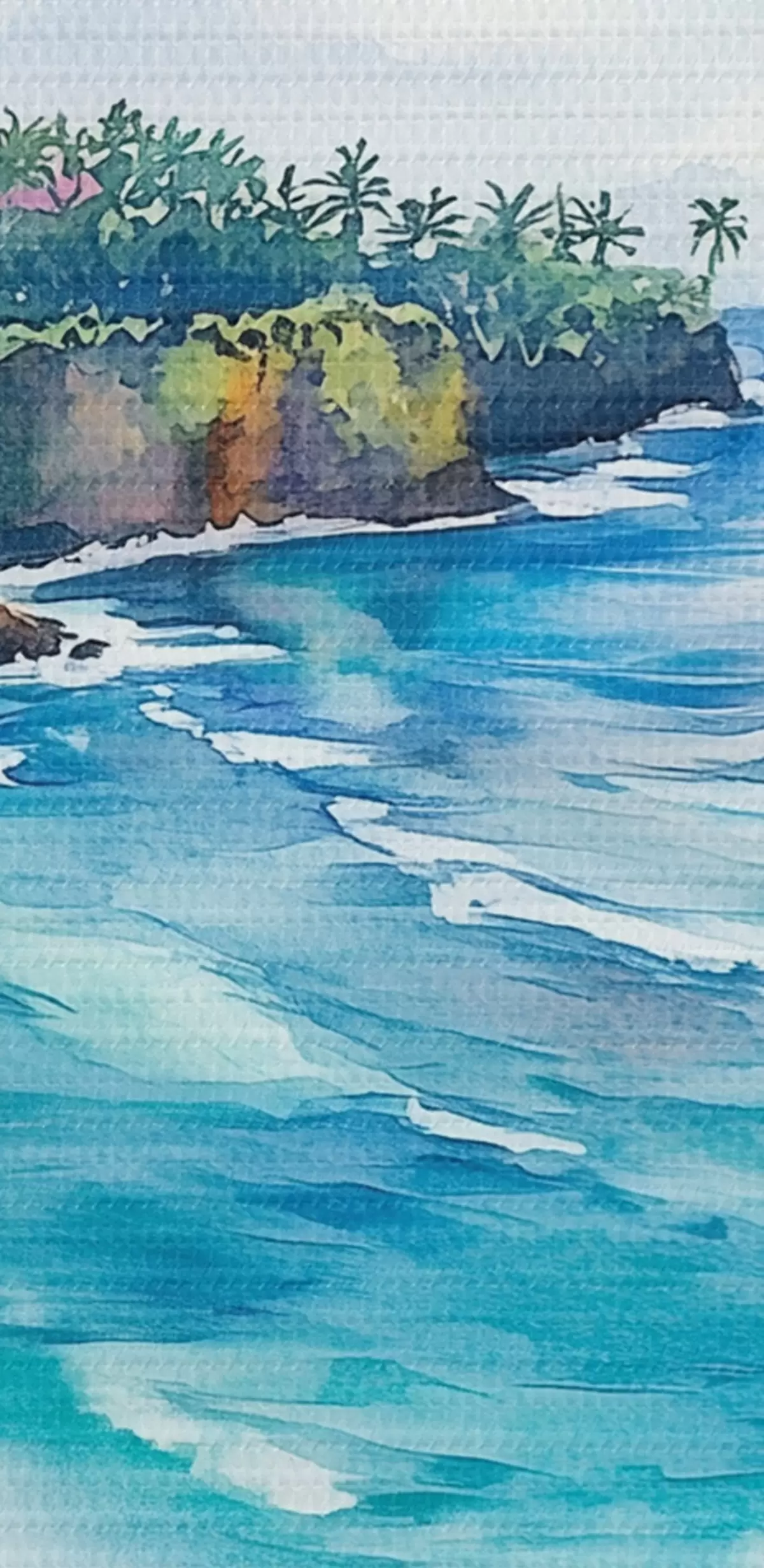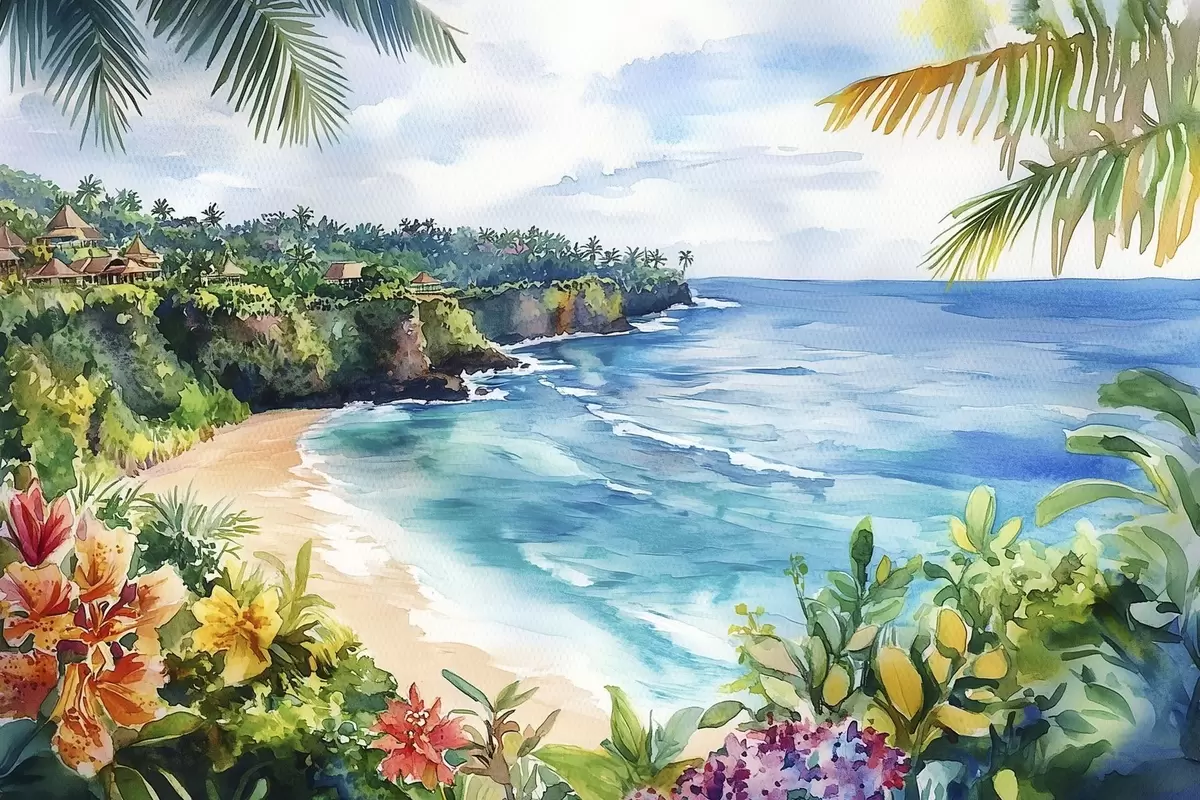 Peinture Plage tropicale, palmiers, fleurs, style aquarelle Art. s44145