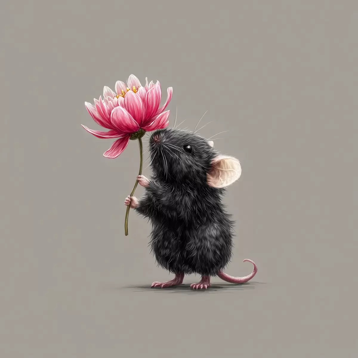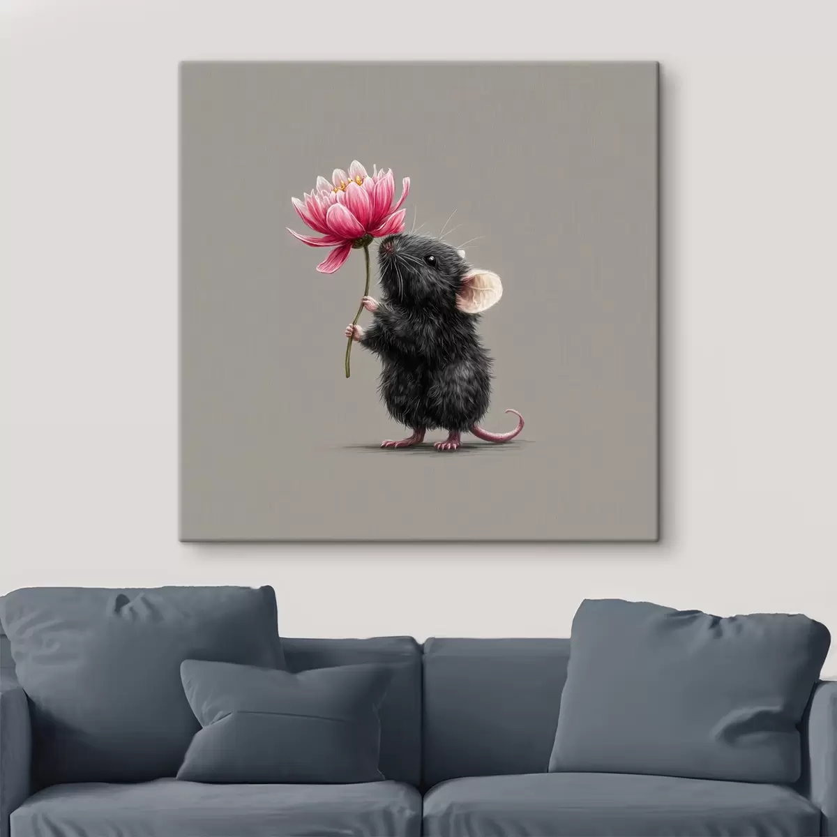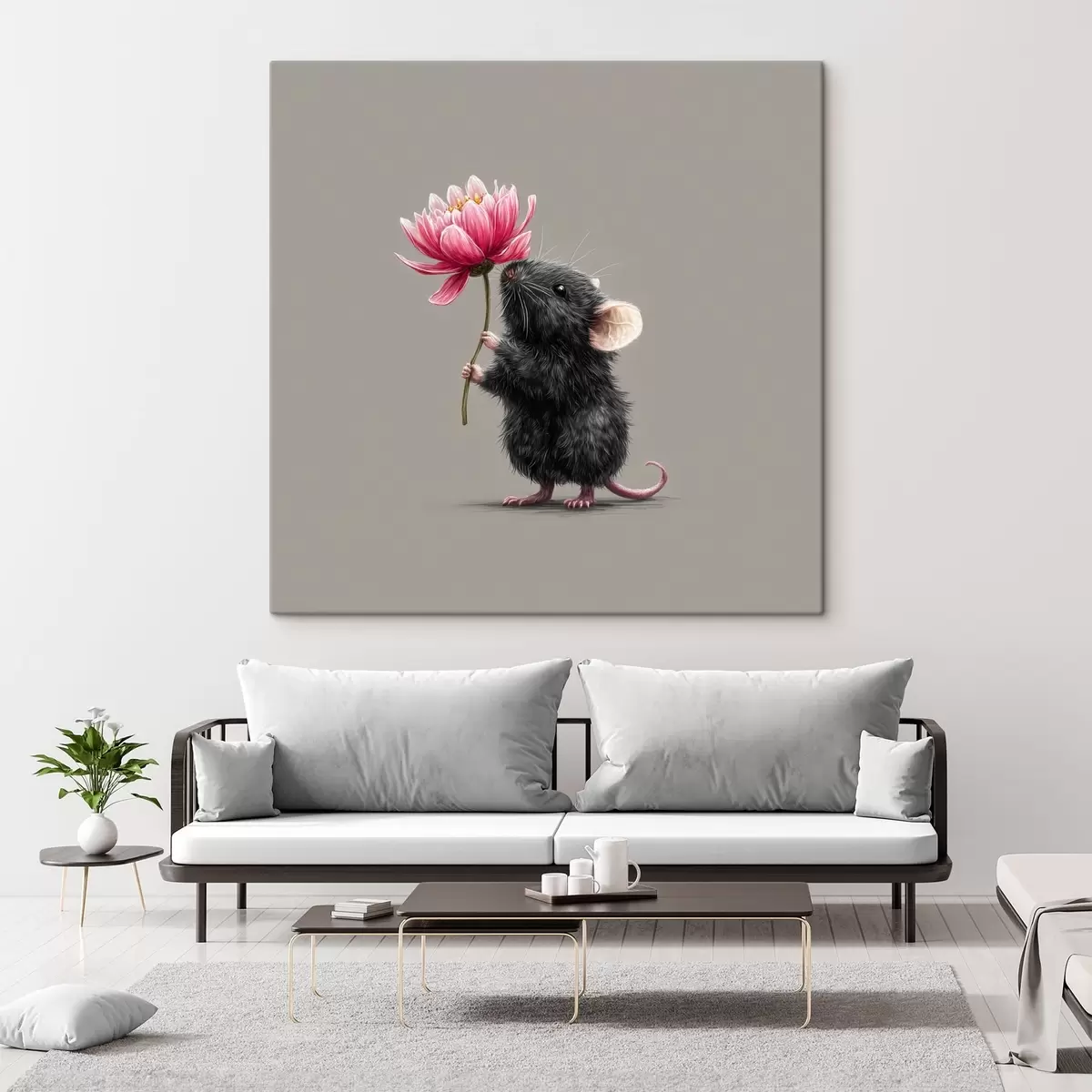 Peinture Charmante souris respirant l'arôme d'une pivoine rose Art. s44248