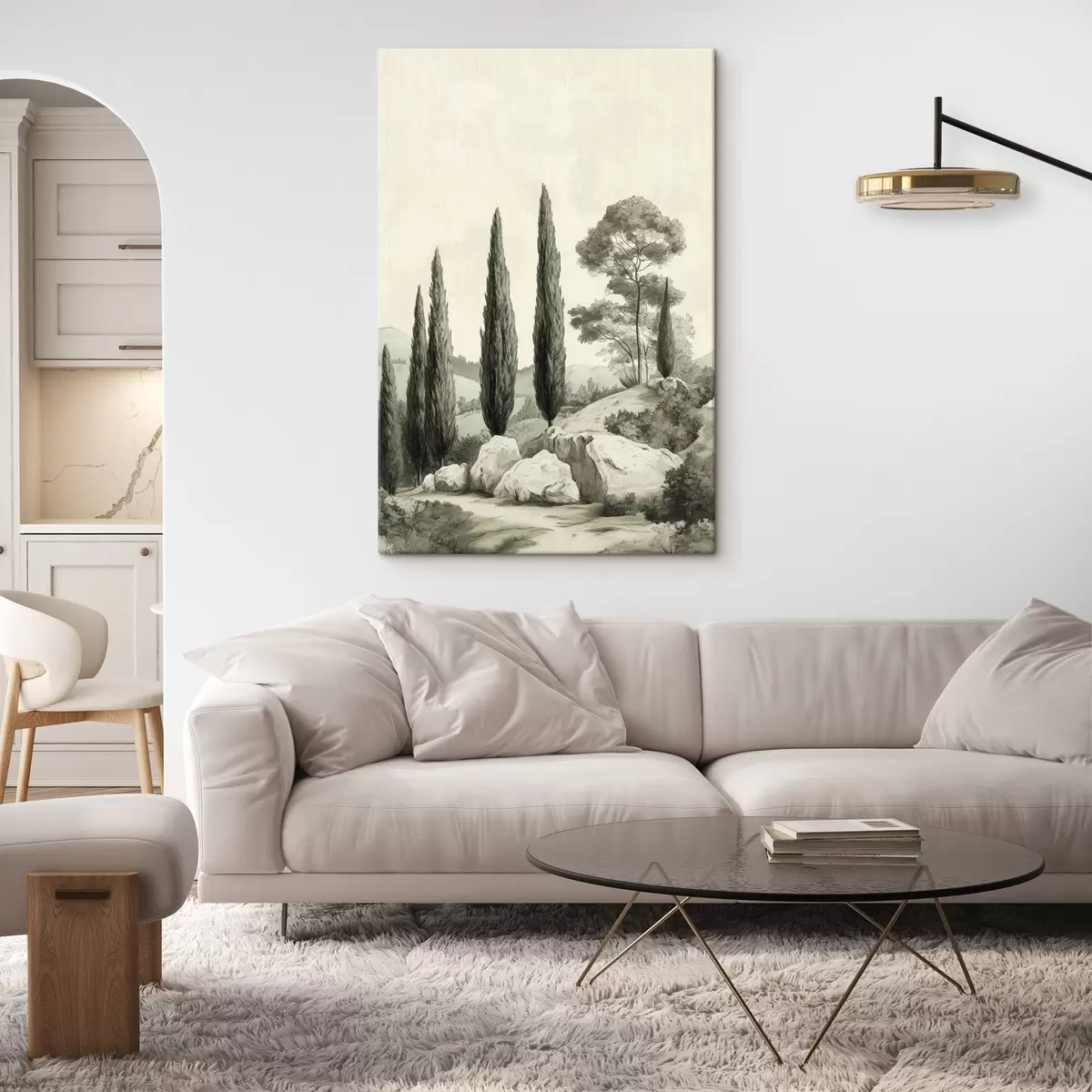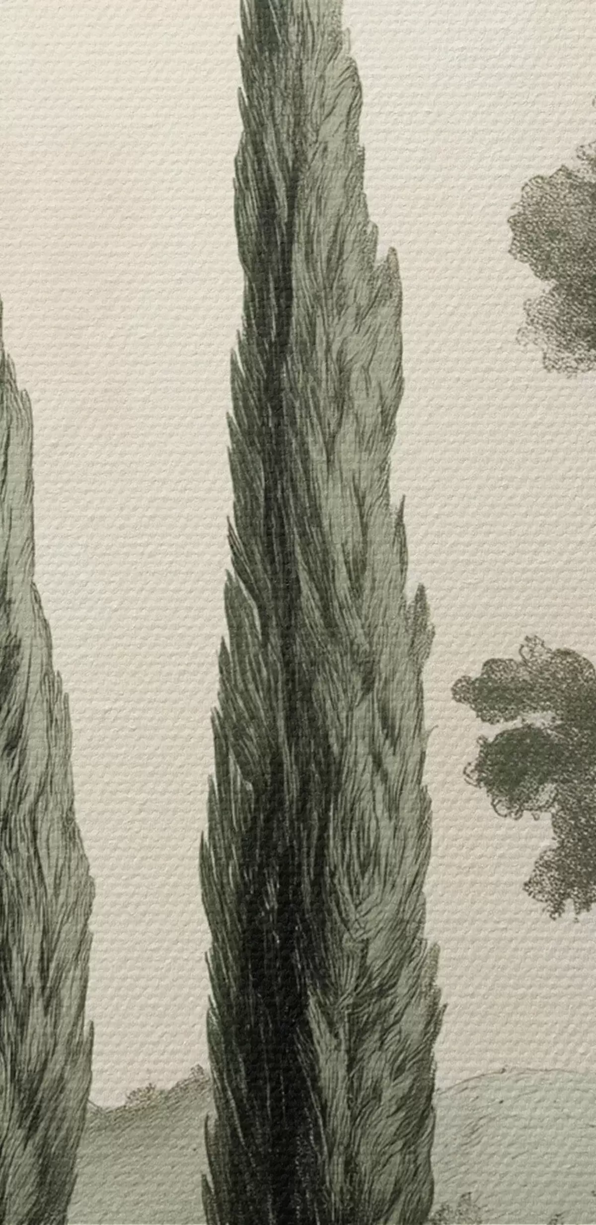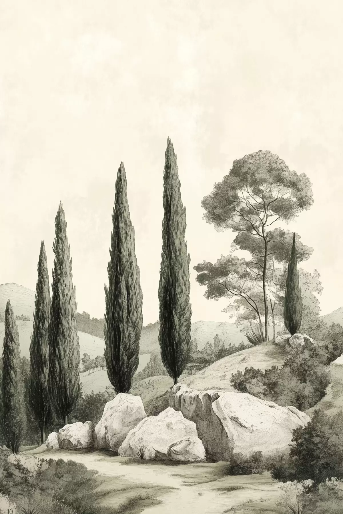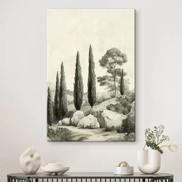 Peinture Paysages de Toscane, couleurs pastel, cyprès, rochers, style rustique Art. s44307