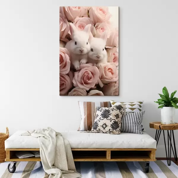 Peinture Deux lapins blancs dans des fleurs de roses délicates Art. s44380