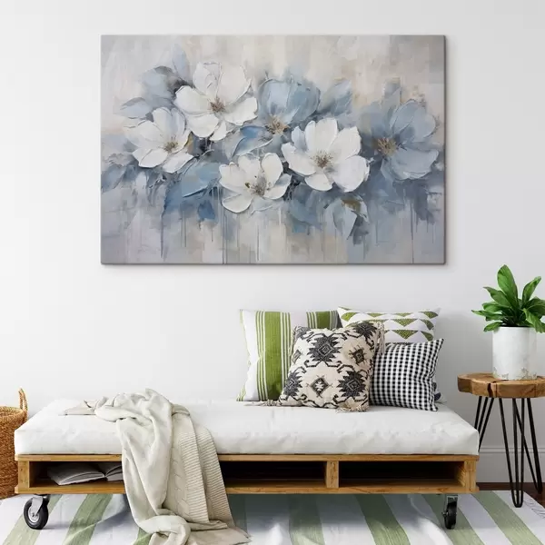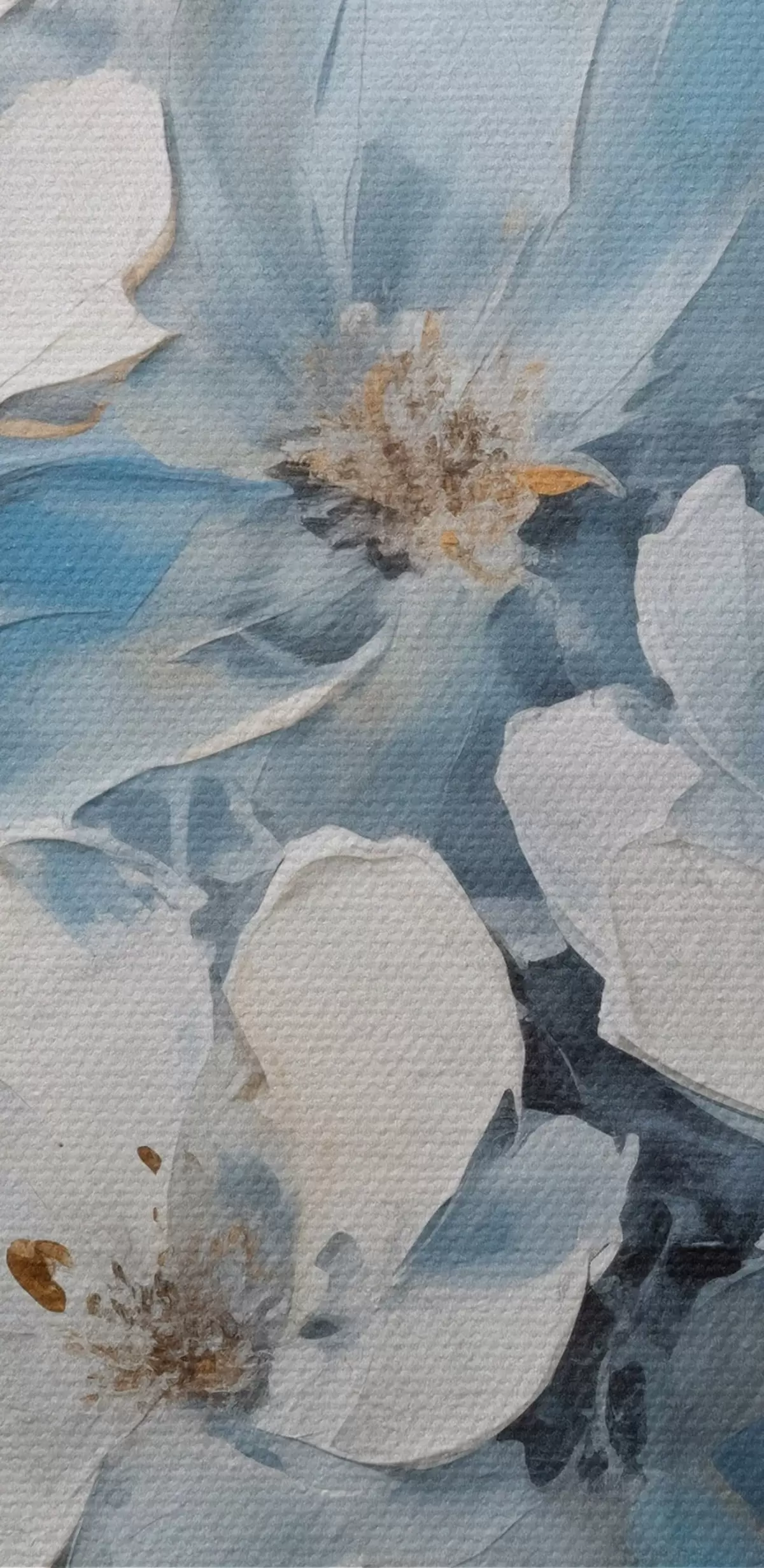 Peintures Fleurs blanches avec des feuilles bleues, sur un fond beige clair, avec des coups de pinceau visibles s44395