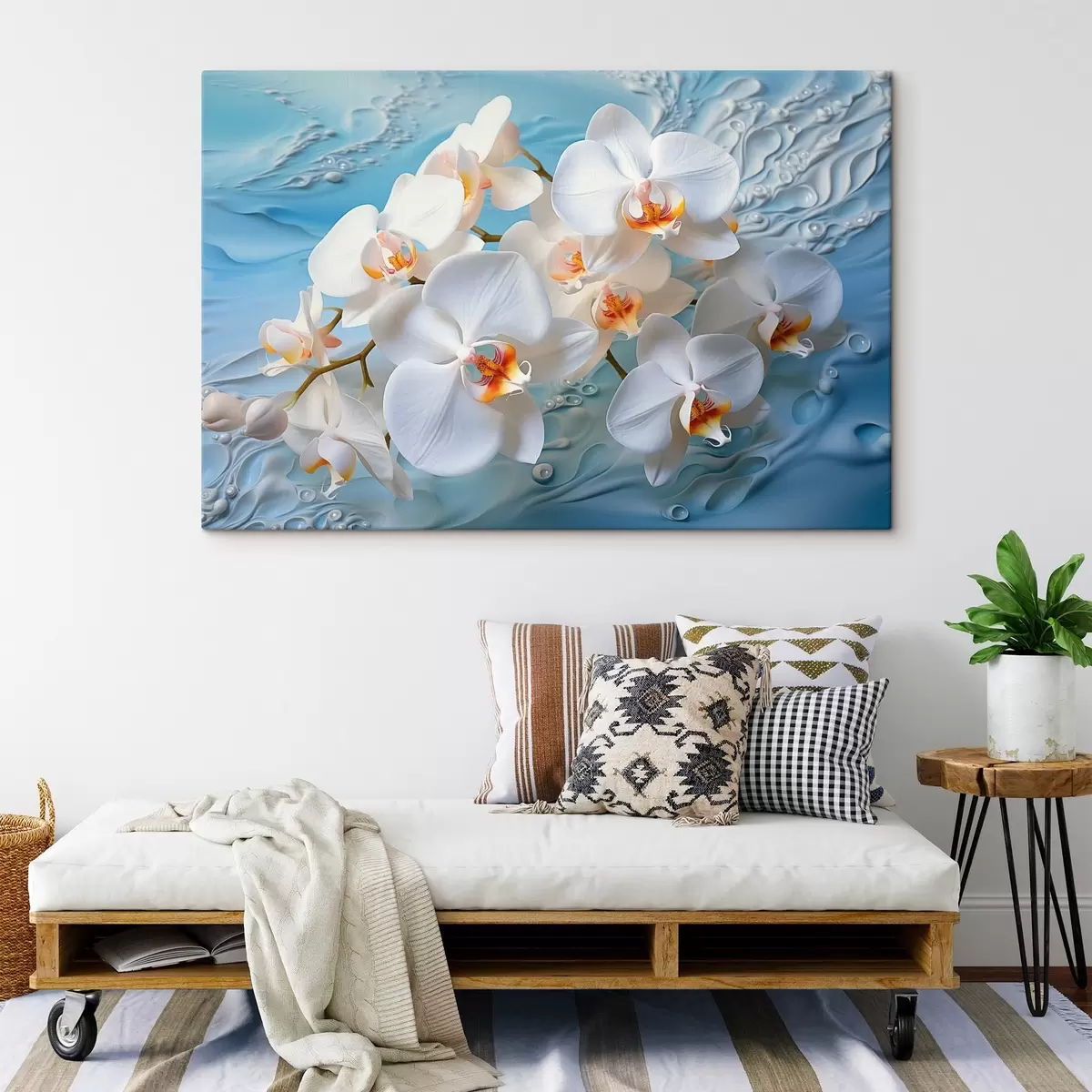 Peinture Orchidées blanches, disposées sur une surface bleu clair avec des gouttelettes d'eau, éclairage doux Art. s44401