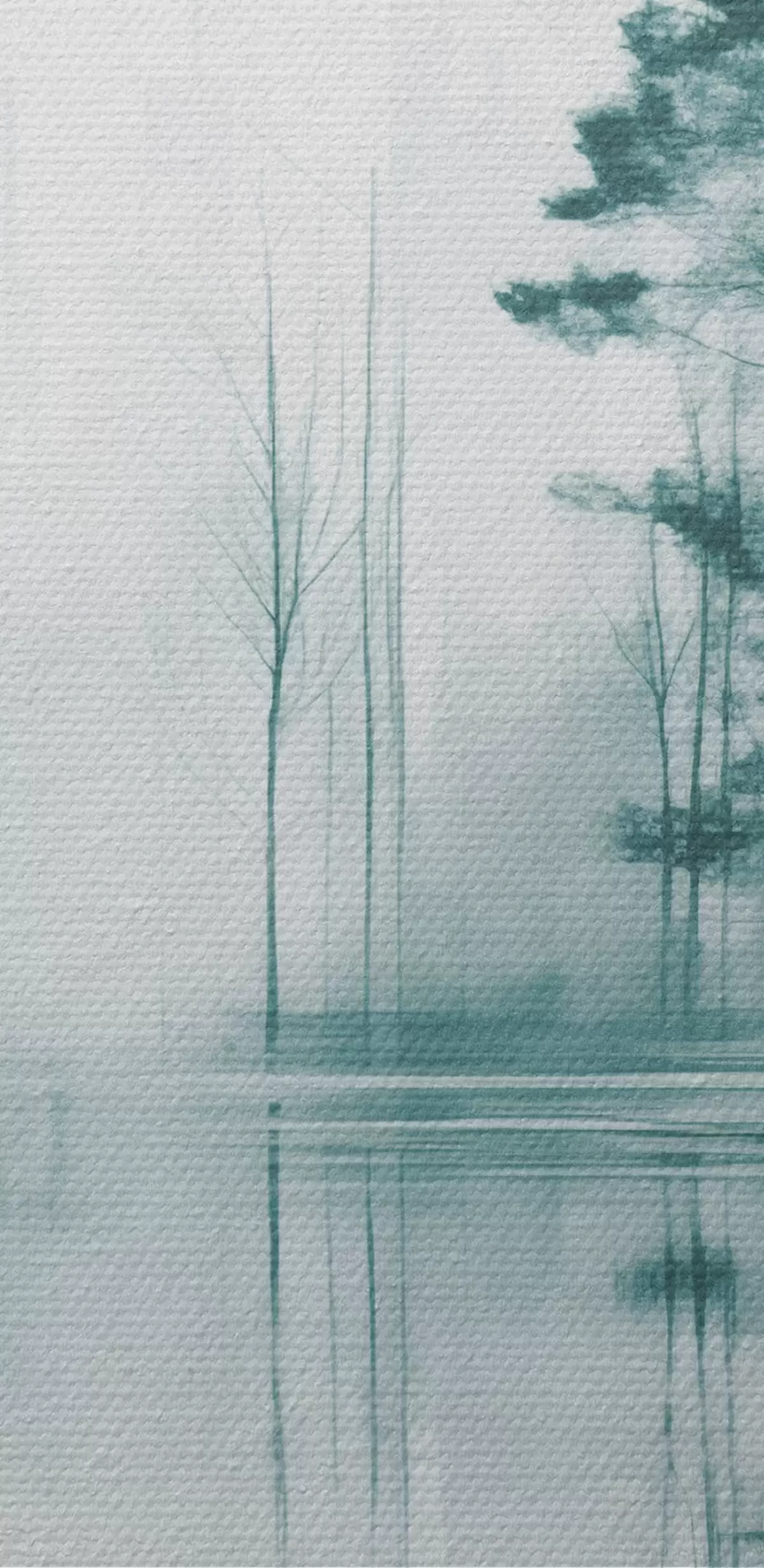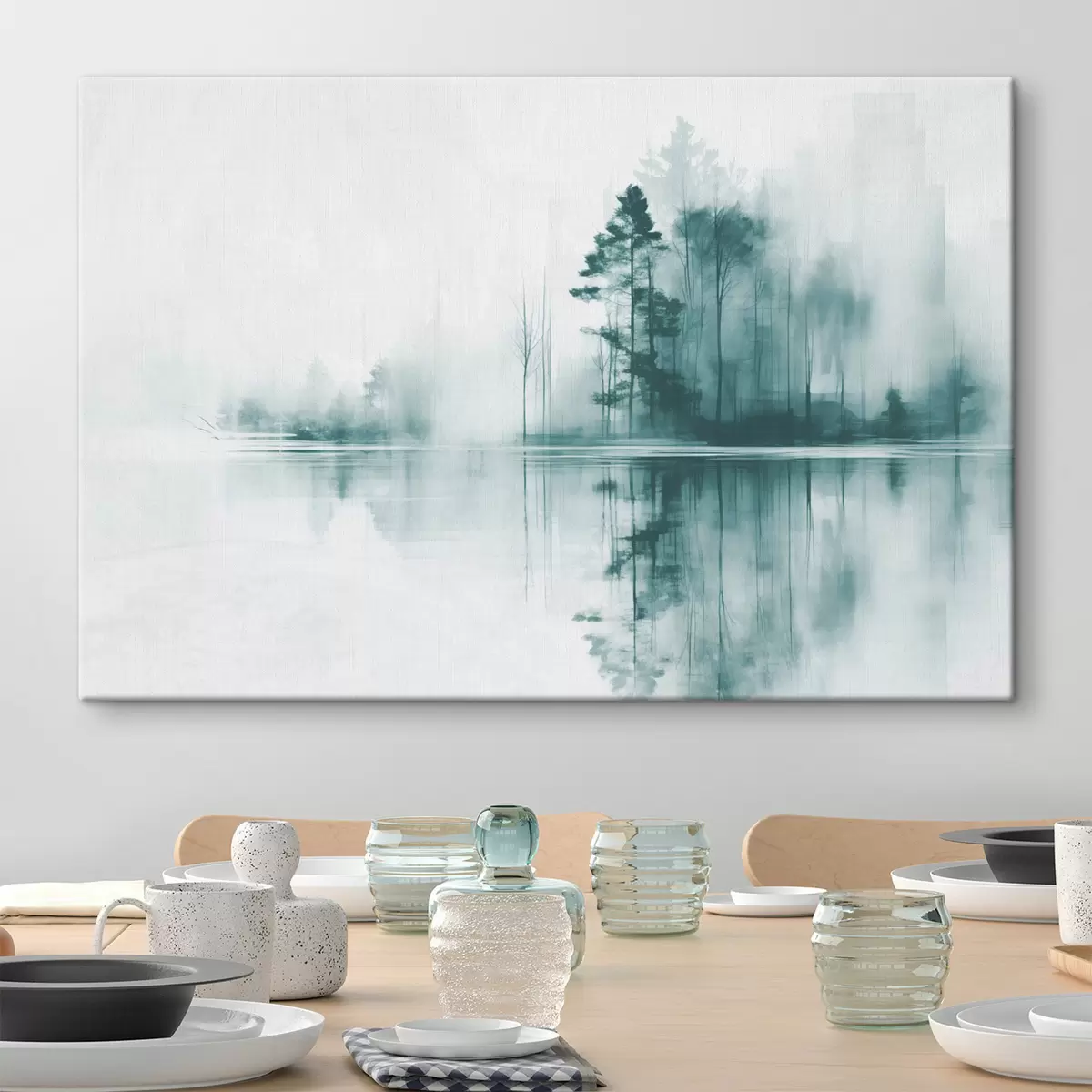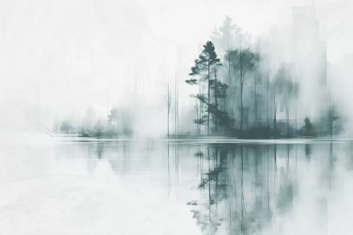 Peinture Forêt abstraite avec de grands arbres se reflétant dans l'eau, palette de couleurs sourdes Art. s44403